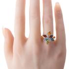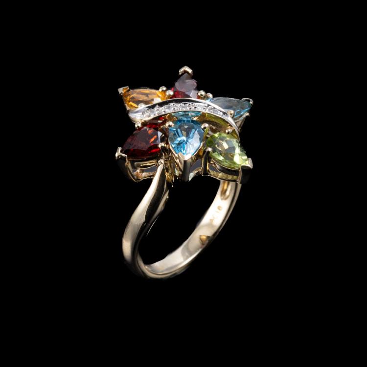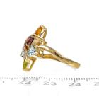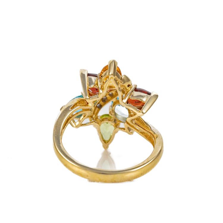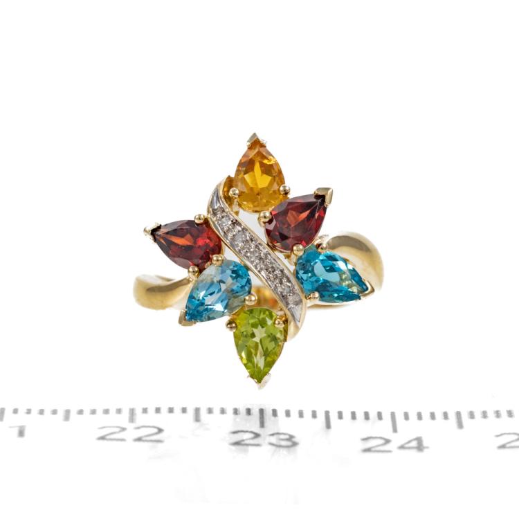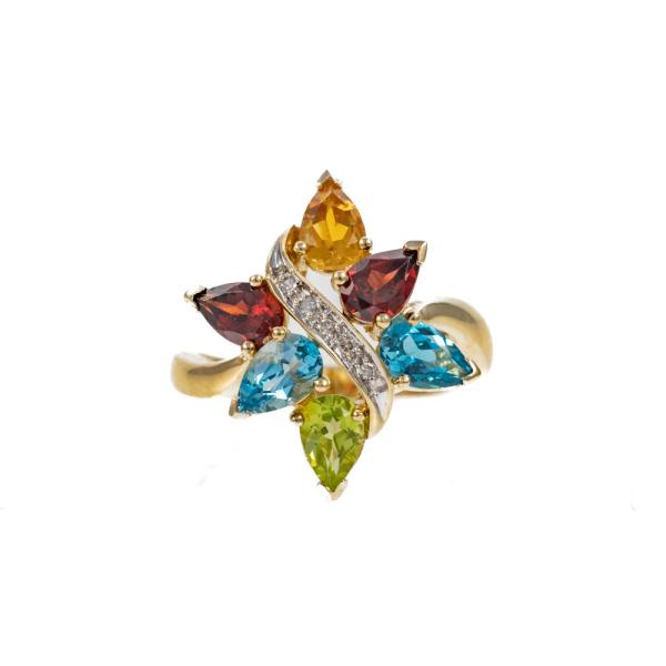 Gemstone ring with pear shape natural Citrine, Topaz, Peridot, & red Garnet (approximate size 5.5x 4mm - 7 x 5.5mm) and round natural Diamonds totalling approximately 0.03cts. 9ct yellow gold. Ring size: M. Band width: 2.4mm. Weight: 4.4g. (Pre-owned)^