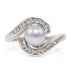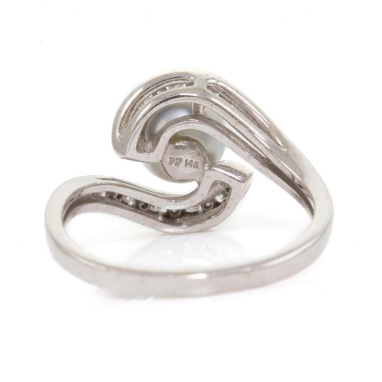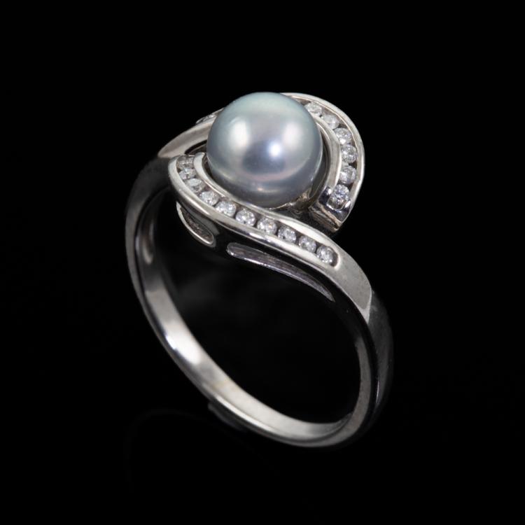 Pearl and Diamond ring with a grey cultured Pearl of 7mm and round Natural Diamonds totalling approximately 0.11cts. 14ct white gold. Ring size P1/2. Band width: 1.9mm-2.4mm. (not light scratches on band). Weight: 4g. (Pre-owned)
