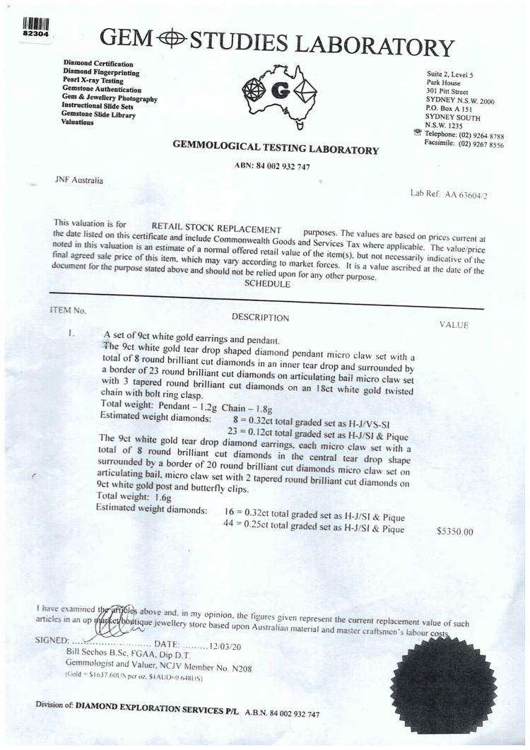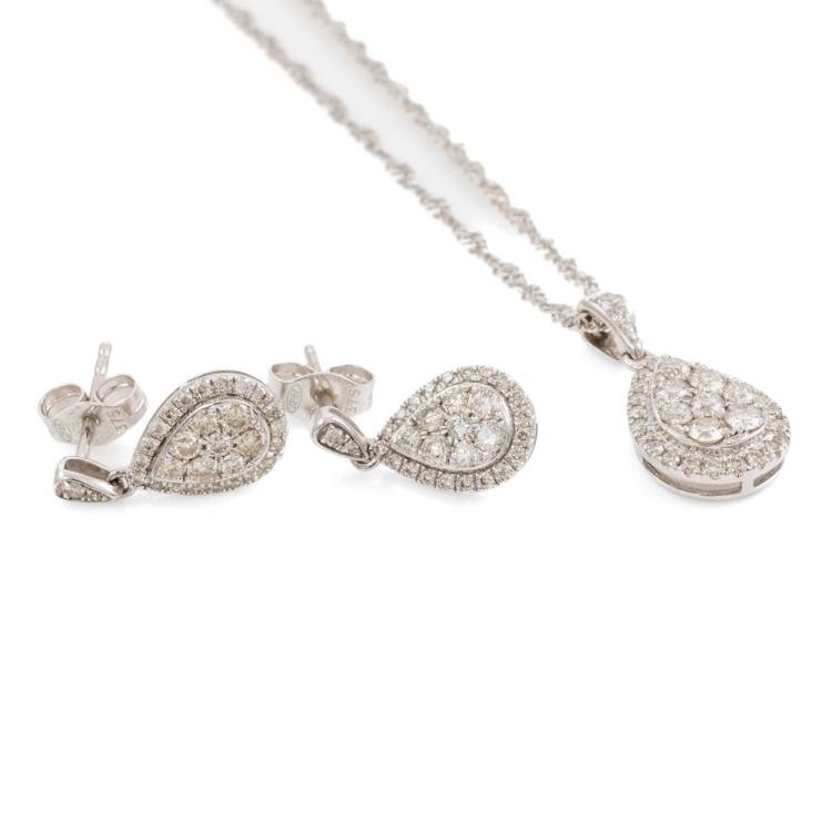 Angus and Coote Diamond pending and Earrings set. Diamond pending with round Diamonds totalling 0.44cts (Estimated grading: H-J VS-P1), 9ct white gold with 41cm 18ct white gold chain, weight: 3.0g. And matching earrings with round Diamonds totalling 0.57cts (Estimated grading: H-J SI-P1), 9ct white gold, weight: 1.6g. Total weight: 4.6g. With copy of GSL Report #AA63604/2. (Pre-owned)^
