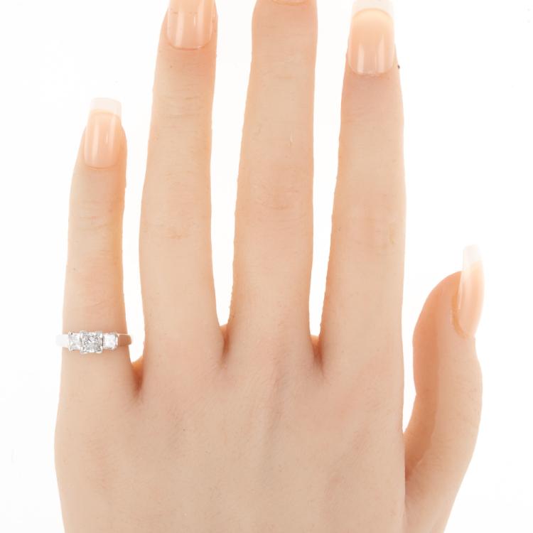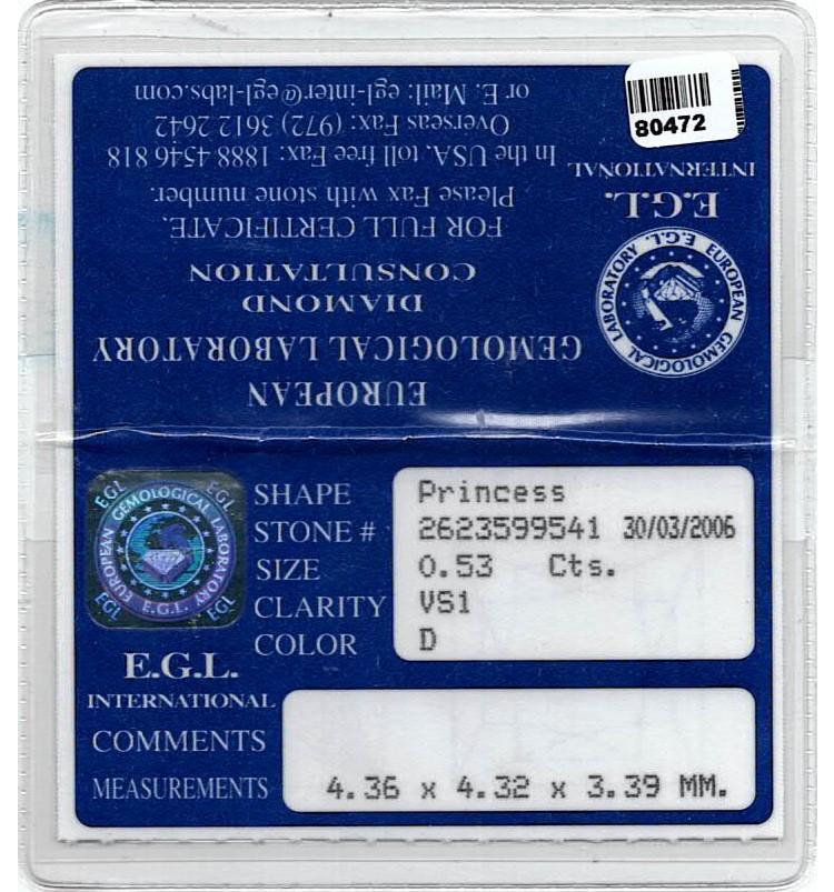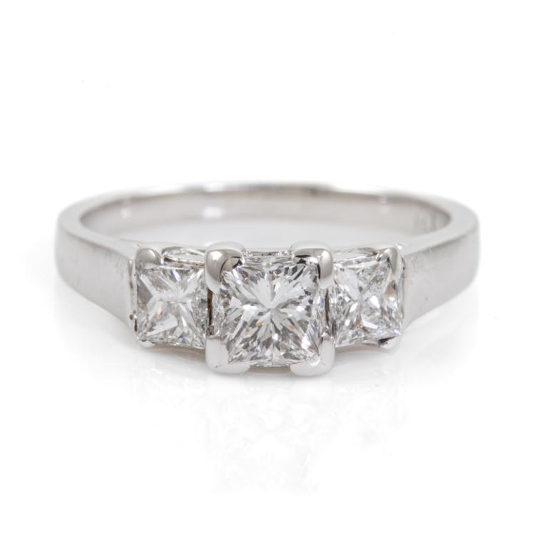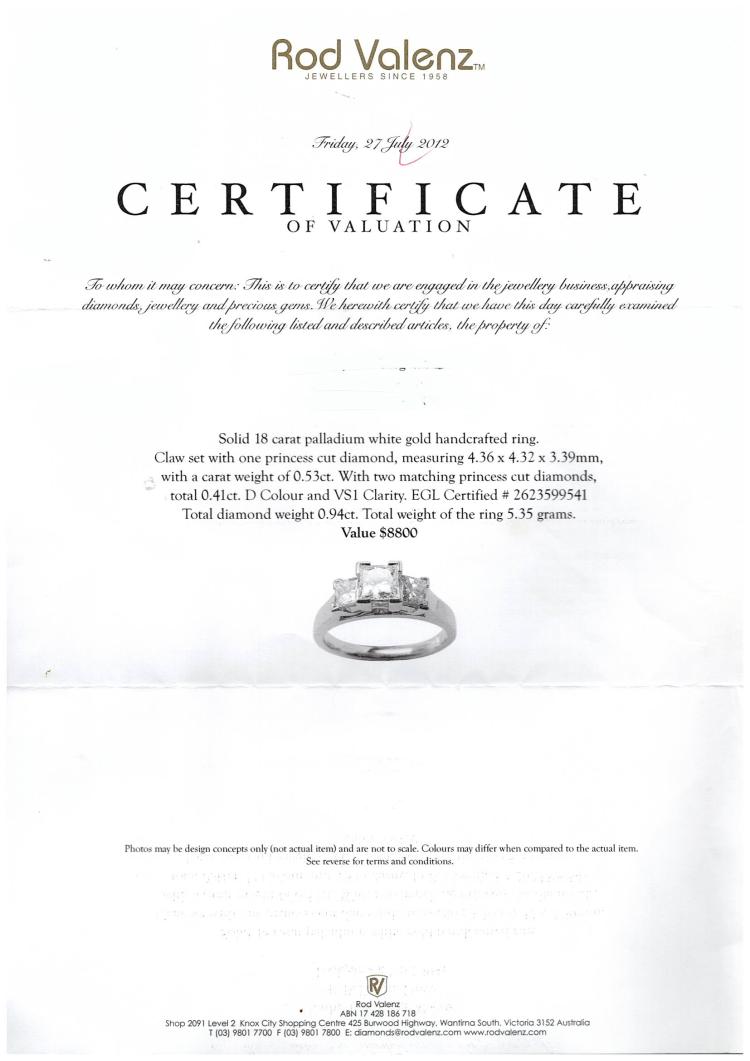 Diamond trilogy ring with a centre princess cut Natural Diamond of 0.53ct (with EGL memo graded as D VS1 #2623599541) and 2 shoulder princess cut Natural Diamonds totalling 0.41cts. 18ct white gold. Ring size G. Band width: 1.6mm-2.9mm. Weight: 3.8g. With Valuation Certificate dated 16/09/2006 (note discrepancy of current ring weight compared to the certificate weight, likely due to resizing down and polishing). (Pre-owned)