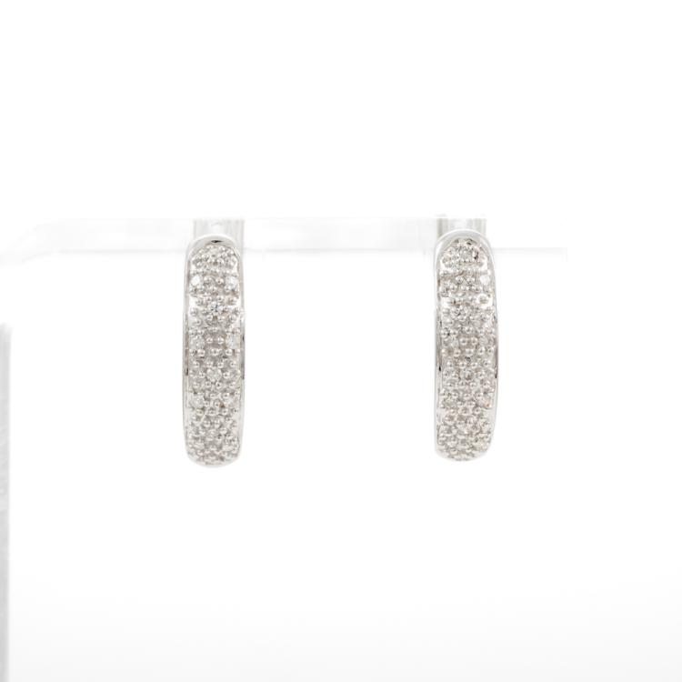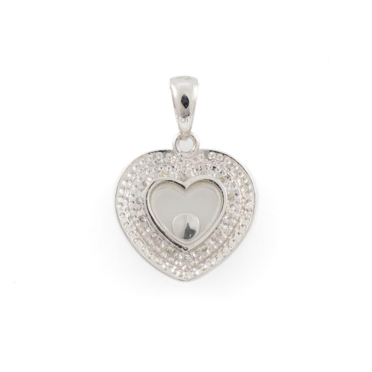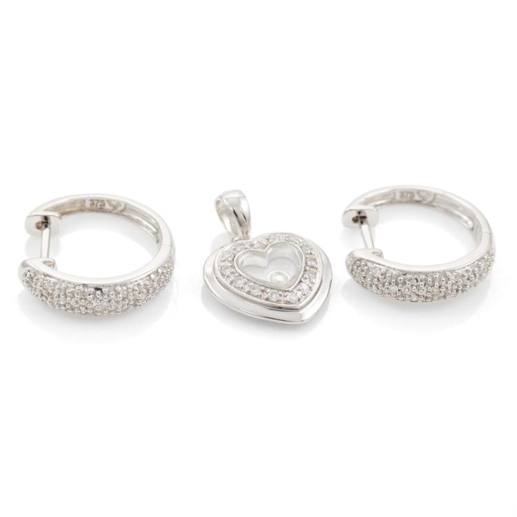 Two piece set: 1) Diamond hoop earrings with round natural Diamonds totalling 0.10ct. 9ct white gold. 2) Diamond heart designed pendant with round & floating natural Diamonds totalling 0.10ct. 9ct white gold. No chain provided. Combined weight of 3.2g. (As new)^