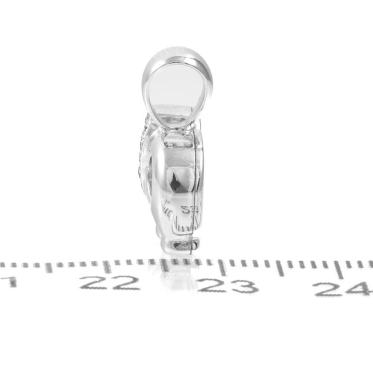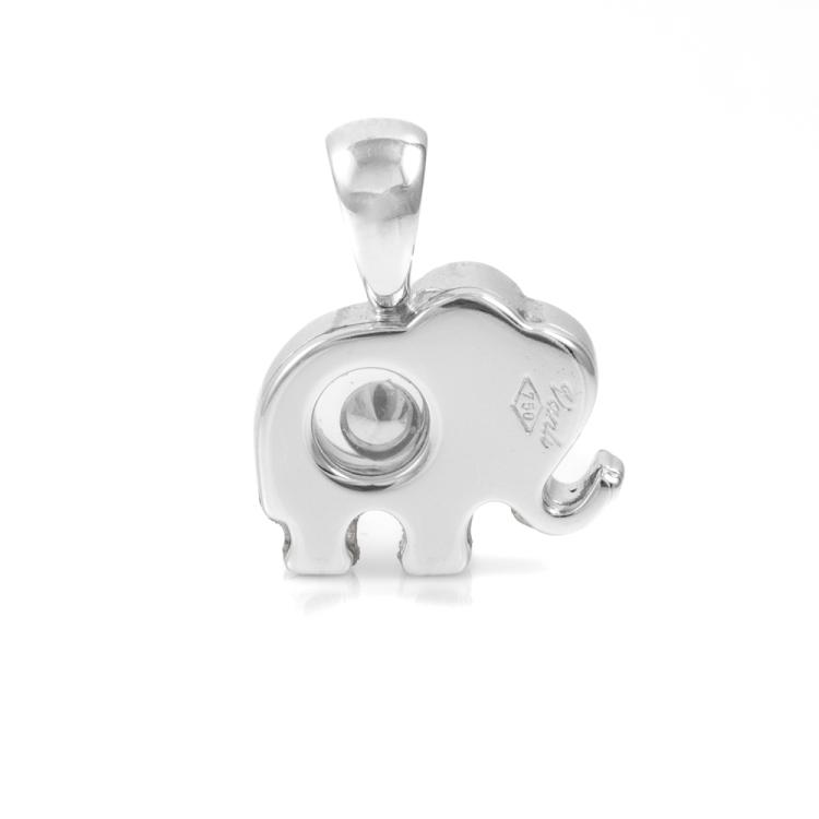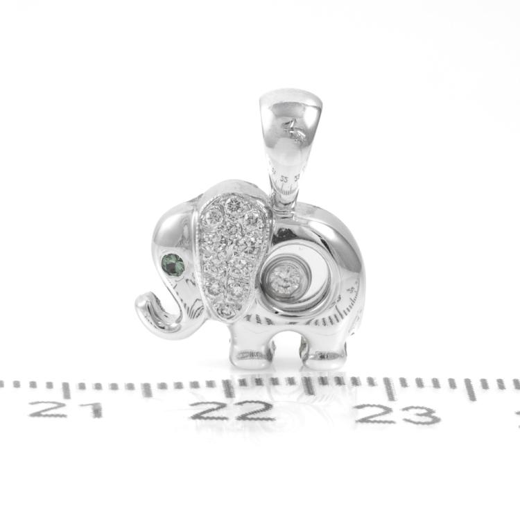 Elephant design pendant with a round Natural Emerald of 0.01ct as elephant eye and 1 floating & remaining round Natural Diamonds totalling 0.25cts. 18ct white gold. No chain provided. Size 14.2mm x 18mm. Weight: 4.7g. (As new)