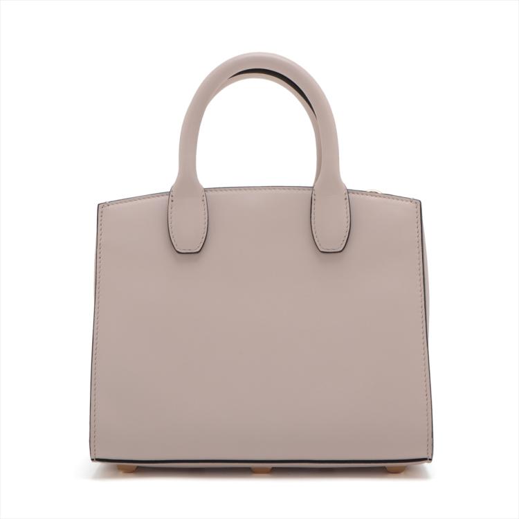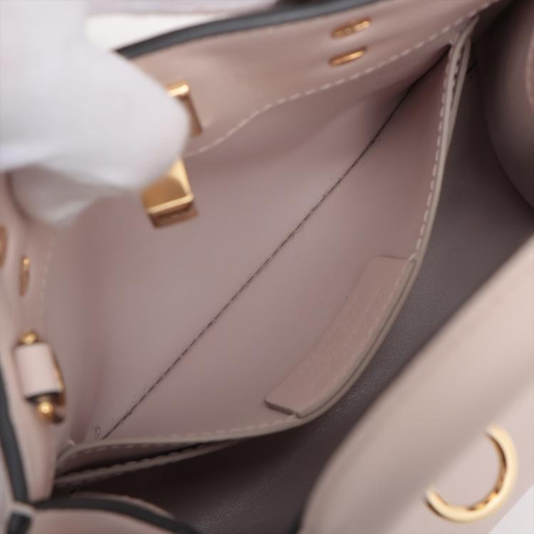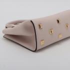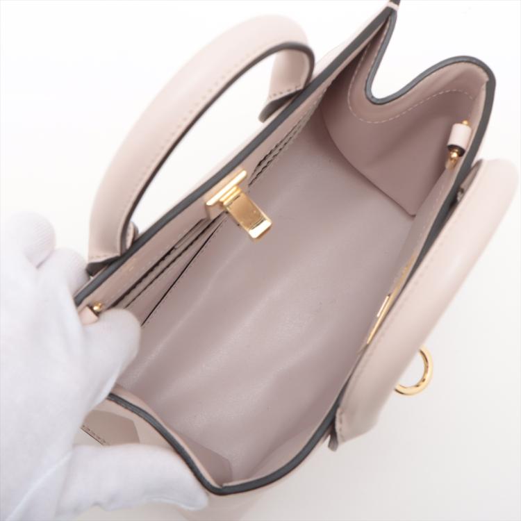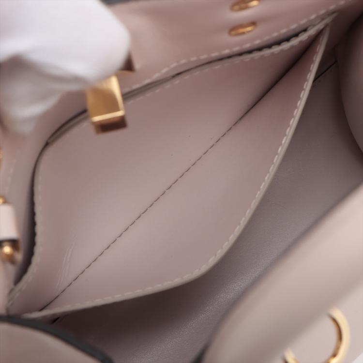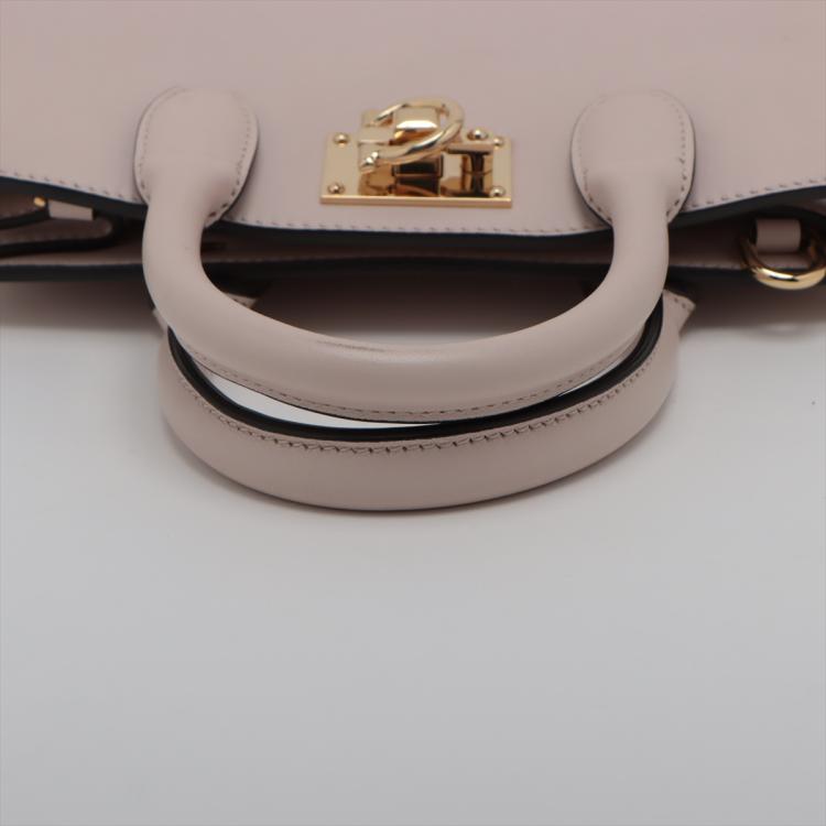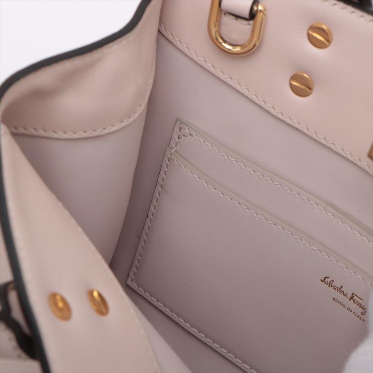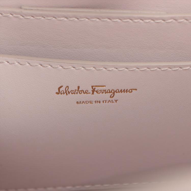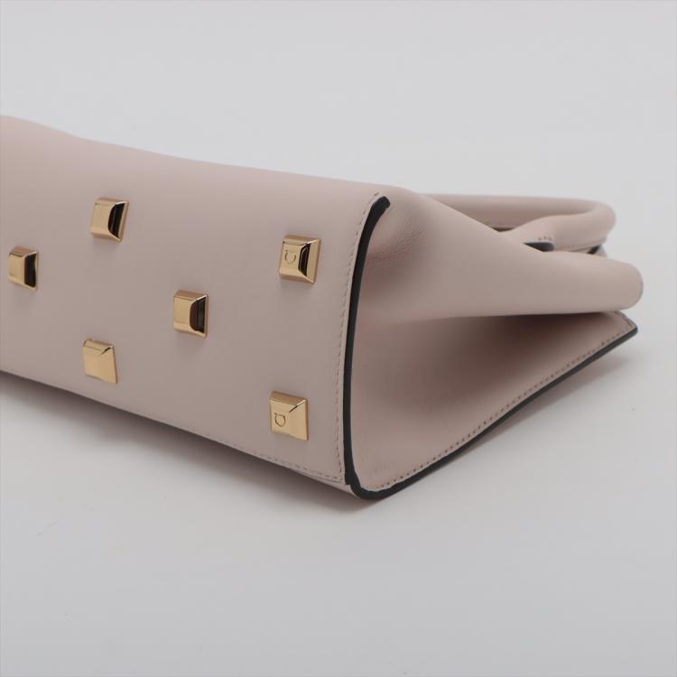 Ferragamo small Studio Box bag in light pink calfskin leather. Featuring dual leather handles, an adjustable and detachable strap, gold-toned hardware, protective studs at bottom. The flip-lock closure opens to a matching leather interior with two flat pockets. Approximate dimensions: 20.5cm(L) x 17cm(H) x 9.5cm(D), handle drop 7.5cm, shoulder drop 57.5cm. Accompanied by a Salvatore Ferragamo dustbag. With Entrupy Certificate of Authenticity. (Pre-owned)