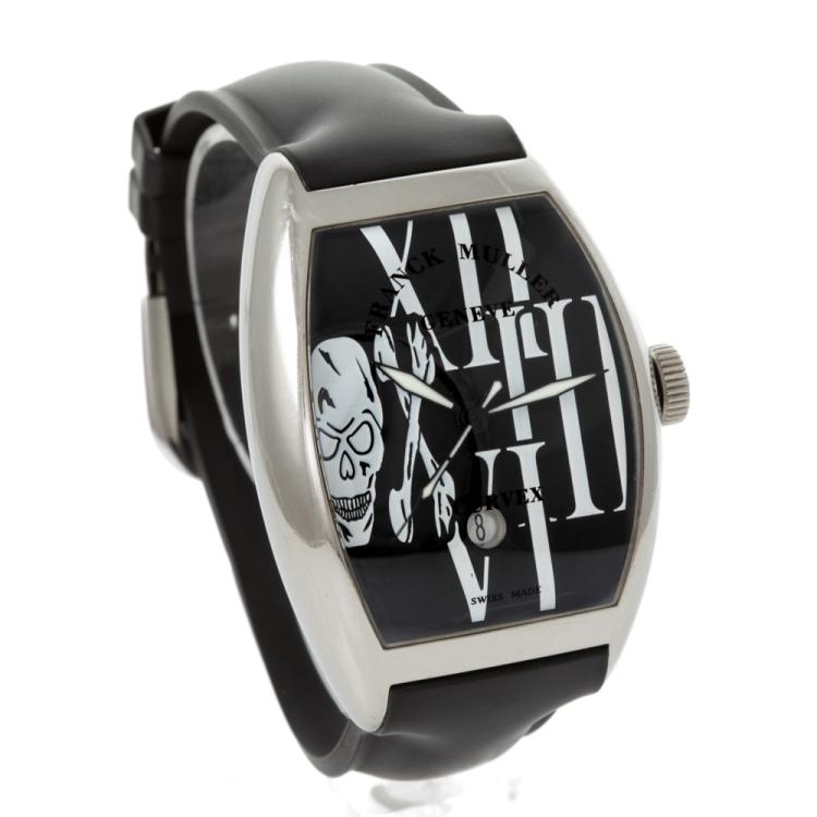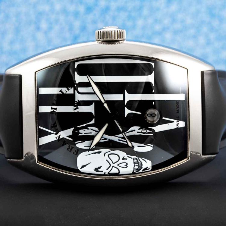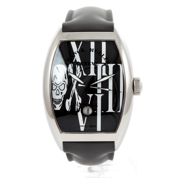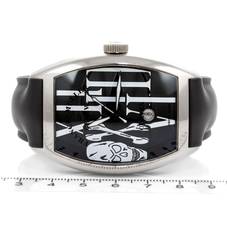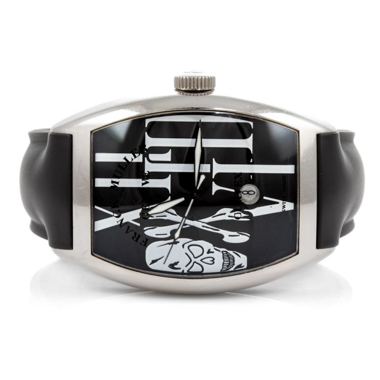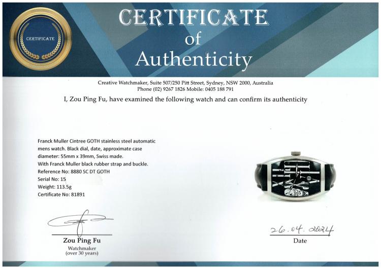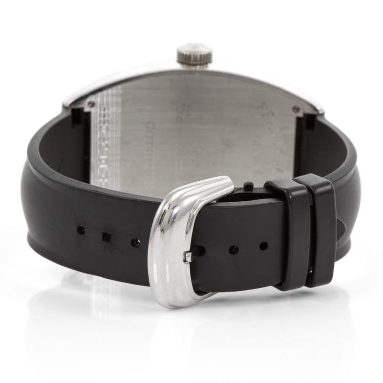 Franck Muller Cintree GOTH stainless steel automatic mens watch. Black dial, date, approximate case diameter: 55mm x 39mm, strap length: 20cm, Swiss made. Ref# 8880 SC DT GOTH. With Franck Muller black rubber strap and buckle. With Certificate of Authenticity, Undated Franck Muller Certificate of Origin & warranty and Franck Muller box. 3 month FSA warranty (Pre-owned)