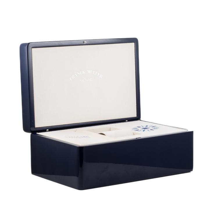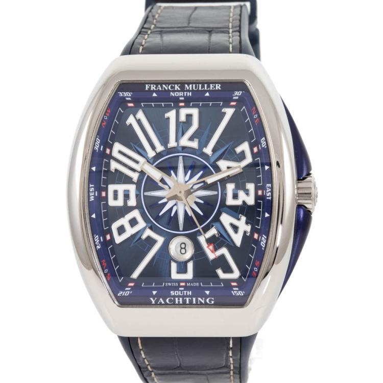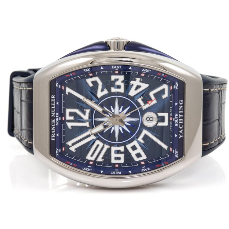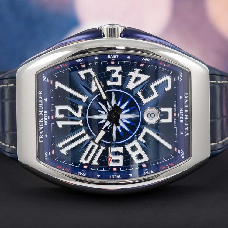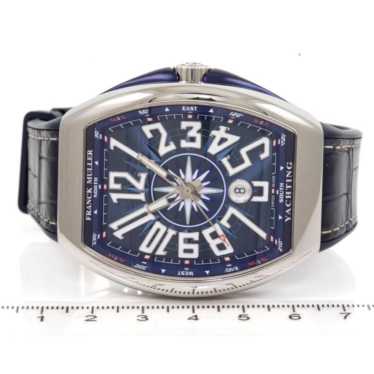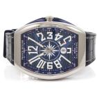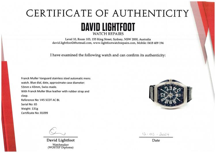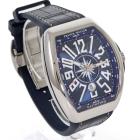 Franck Muller Vanguard stainless steel automatic mens watch. Blue dial, date, approximate case diameter: 53mm x 43mm, adjustable max wrist size: 19cm, Swiss made. Ref# V45 SCDT AC BL. With Franck Muller Blue leather and rubber strap and clasp. With Certificate of Authenticity, Undated Franck Muller Certificate of Origin & Warranty and Franck Muller box. 3 month FSA warranty (pre-owned)