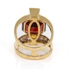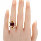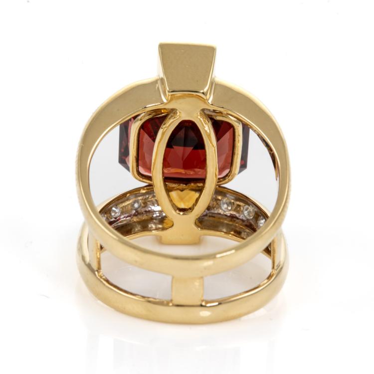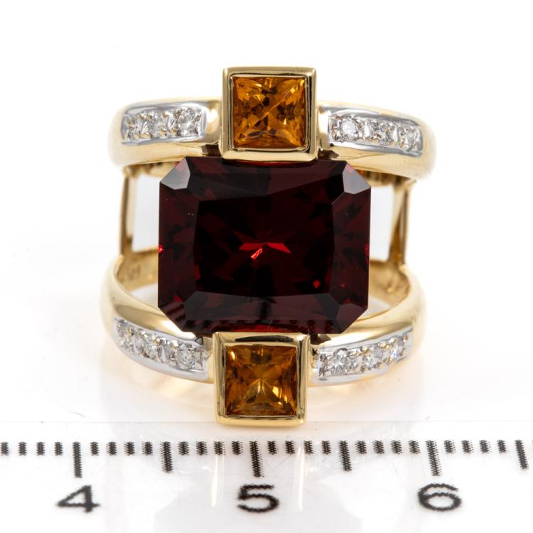 Garnet, Citrine and Diamond ring with emerald cut red Natural Garnet of 6.90ct, 2 radiant cut Natural Citrine totalling 0.60cts and round Natural Diamonds totalling 0.19cts. 18ct yellow gold. Ring size L - ring resizing is not recommended. Weight: 9.2g. (Pre-owned)