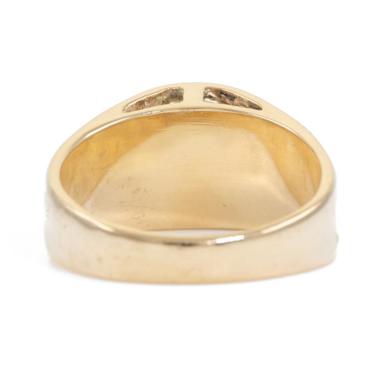 Mens Ring with oval natural Gold-bearing Quartz of approximately 1.20ct. 14ct yellow ring. Ring size V. Band width 4mm - 6.8mm. Weight 10.9g (Pre-owned)