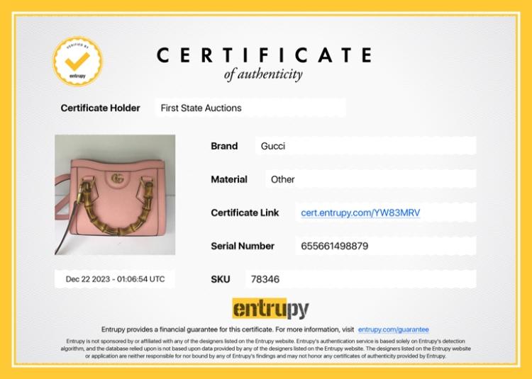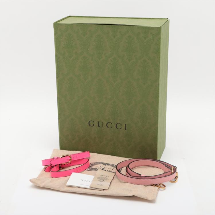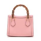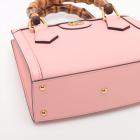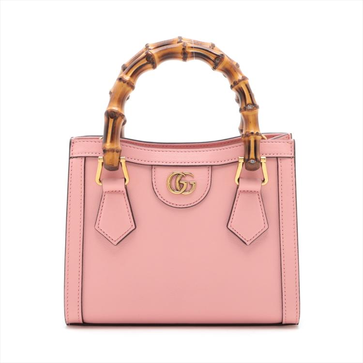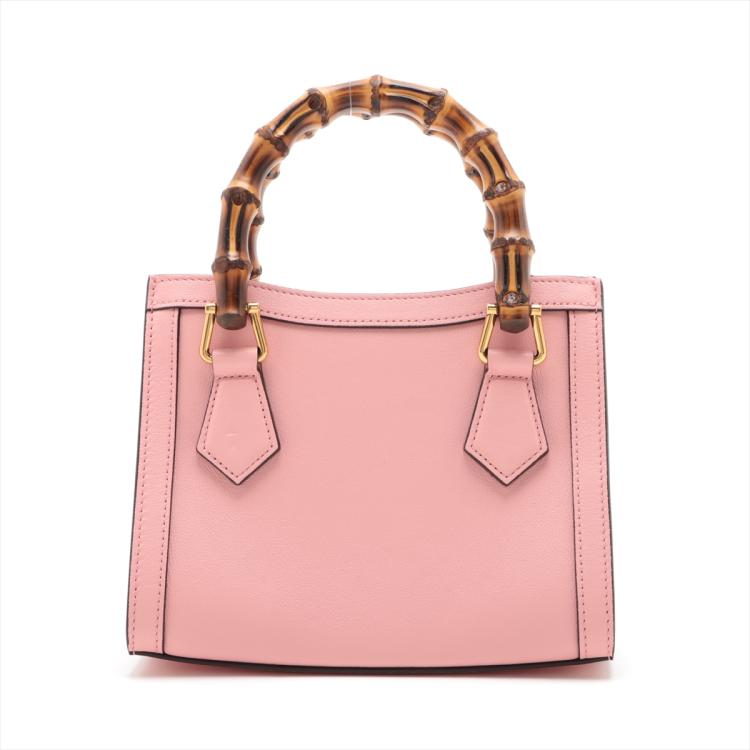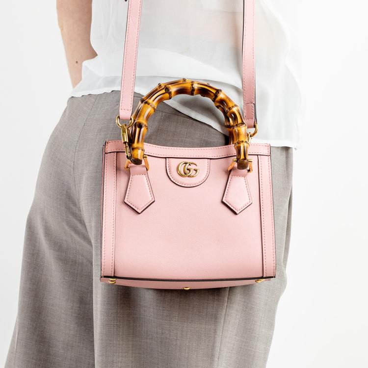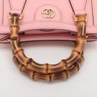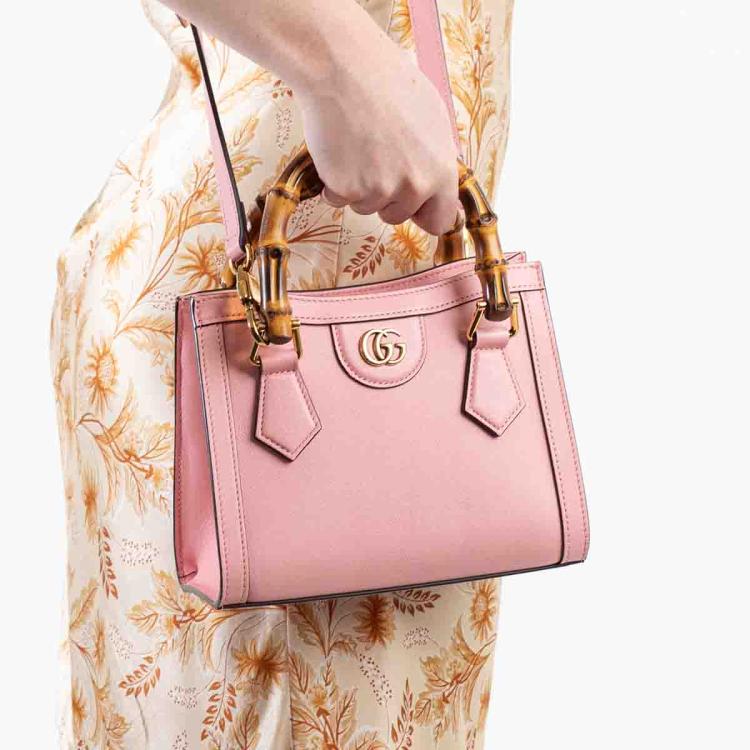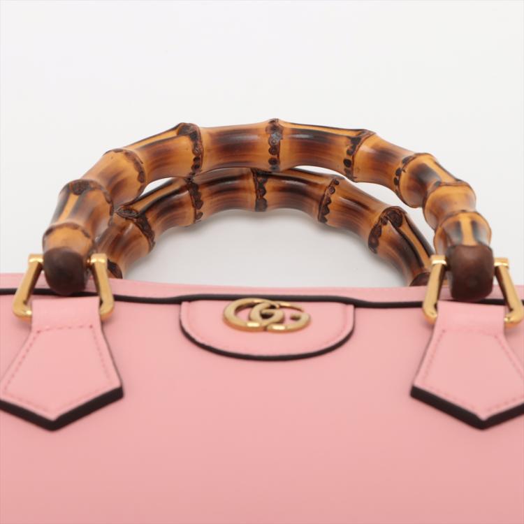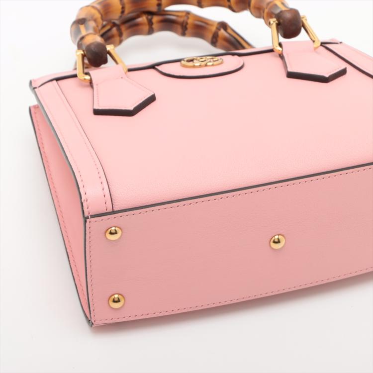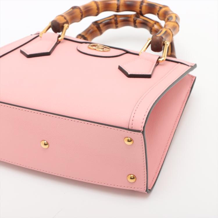 Gucci Diana mini tote bag in pink leather. Featuring gold-toned hardware, bamboo handles with hot pink decorative belts, double G logo at front, magnetic button closure. The top opens to a beige microfibre lining interior. Approximate dimensions: 20cm(L) x 15cm(H) x 9cm(D), 7cm handle drop and 53cm(max) adjustable & detachable strap drop. Accompanied by Gucci dust bag and box. With Entrupy Certificate of Authenticity. (Pre-owned)