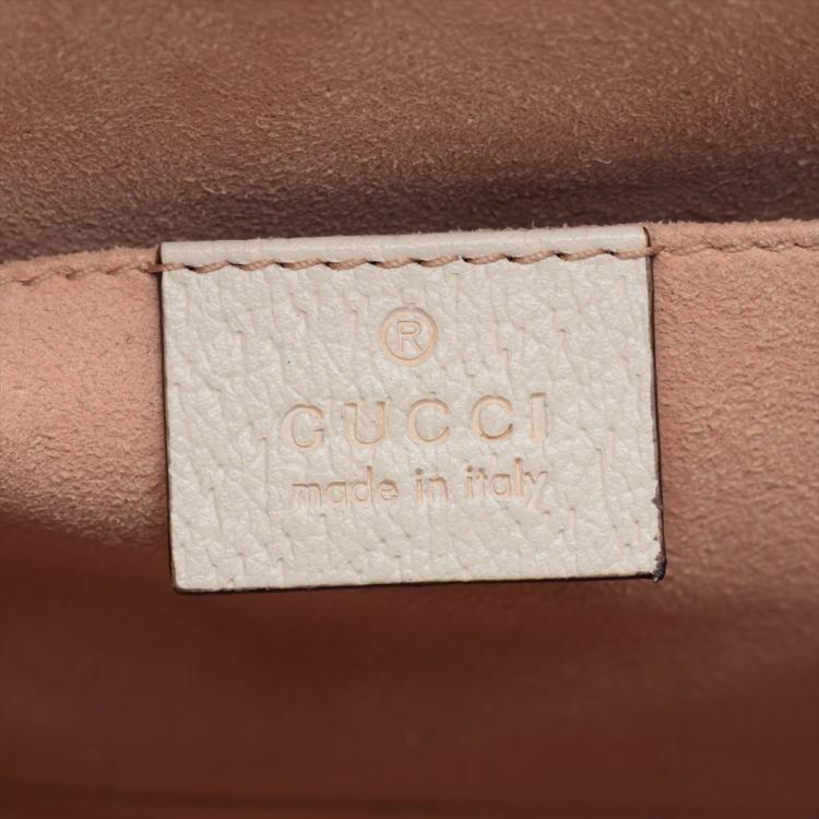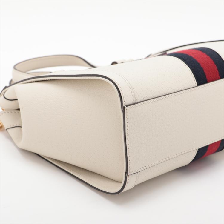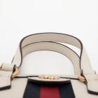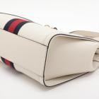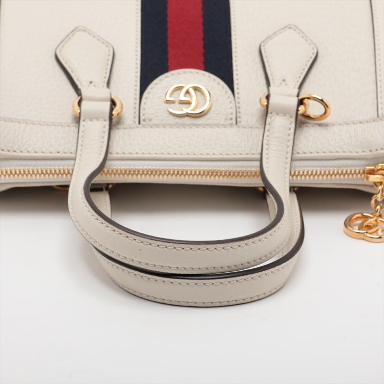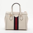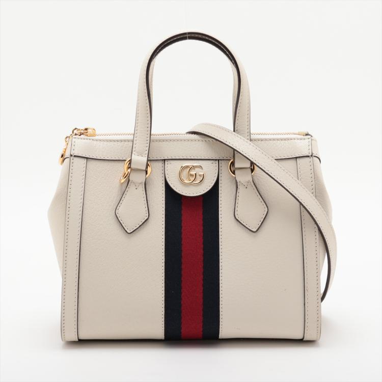 Gucci small Ophidia web tote in white leather. Featuring white leather trim, black & red web stripe, gold-tone hardware, dual leather top handles, zip closure with GG logo detail. The top opens to a blush pink suede interior with a patch pocket. Approximate dimensions: 24cm(L) x 20.5cm(H) x 10.5cm(D), 7cm handle drop and 62cm (max) detachable and adjustable strap drop. Accompanied by Gucci dust bag and box. With Entrupy Certificate of Authenticity. (Pre-owned)