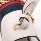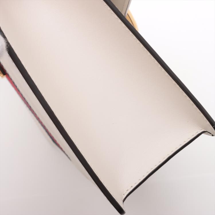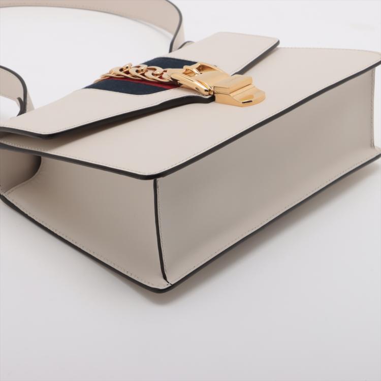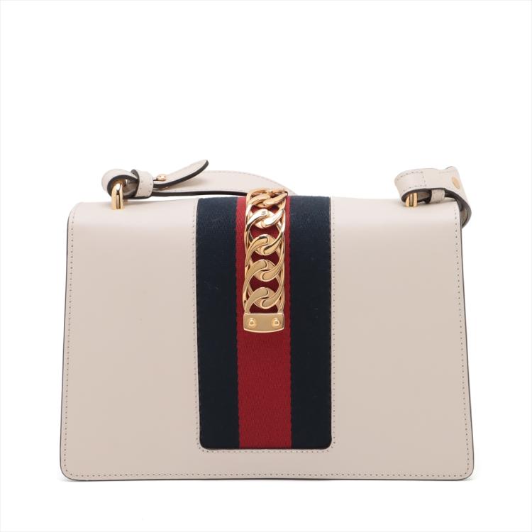 Gucci small Sylvie shoulder bag in off white calfskin leather. Featuring a front flap detailed with a central red and navy web stripe, a chain buckle lock closure at the front, gold-tone hardware. The flap opens to a microfiber lining interior with zipper and patch pockets. Approximate dimensions: 26cm(W) x 17cm(H) x 8cm(D), 35cm leather strap drop. Note: striped ribbon NOT included. With Entrupy Certificate of Authenticity. (Pre-owned)
