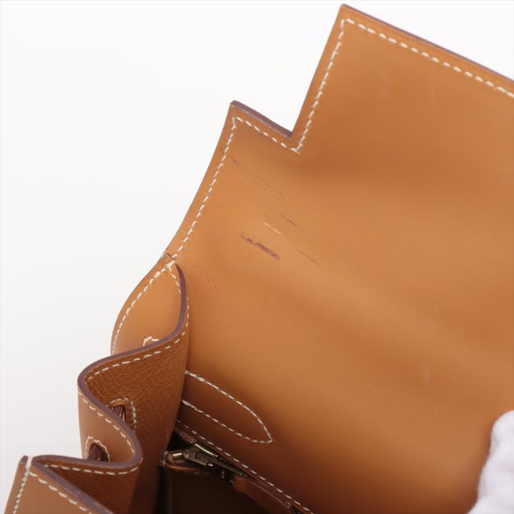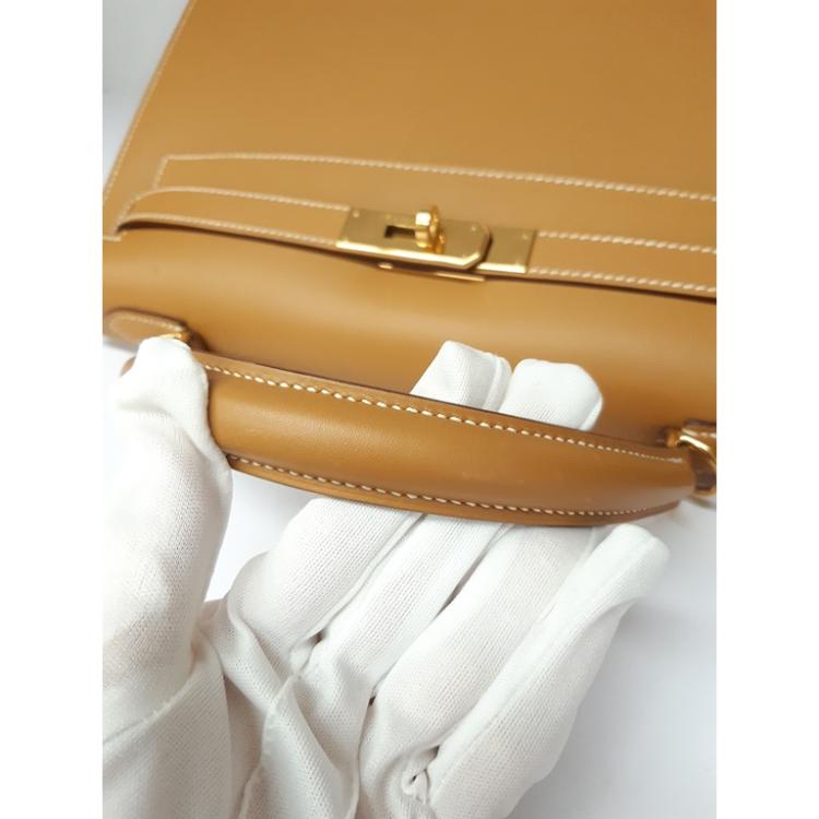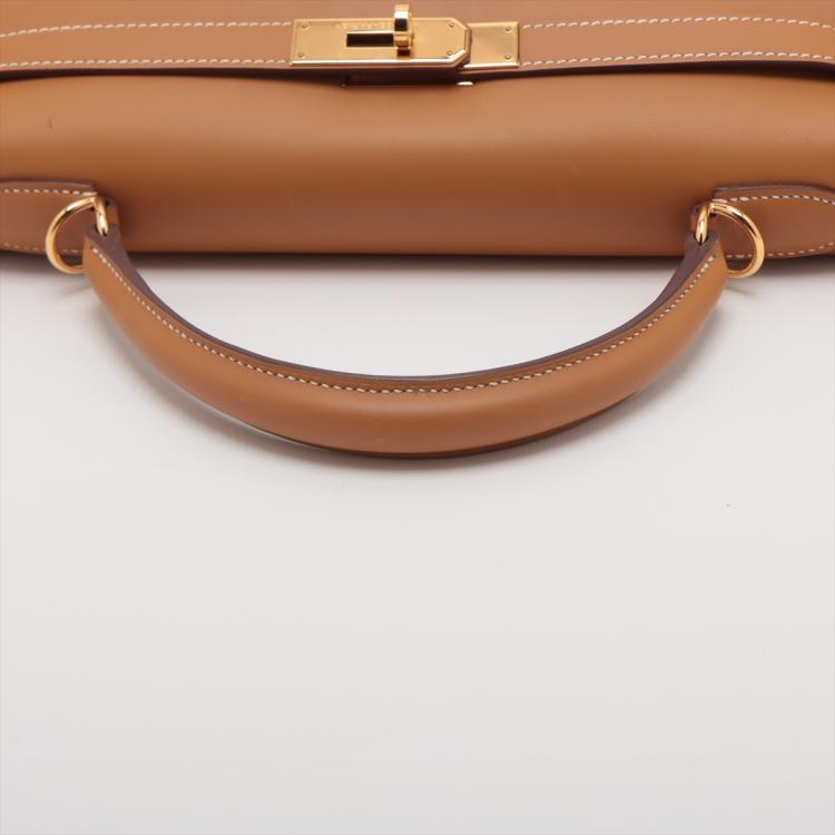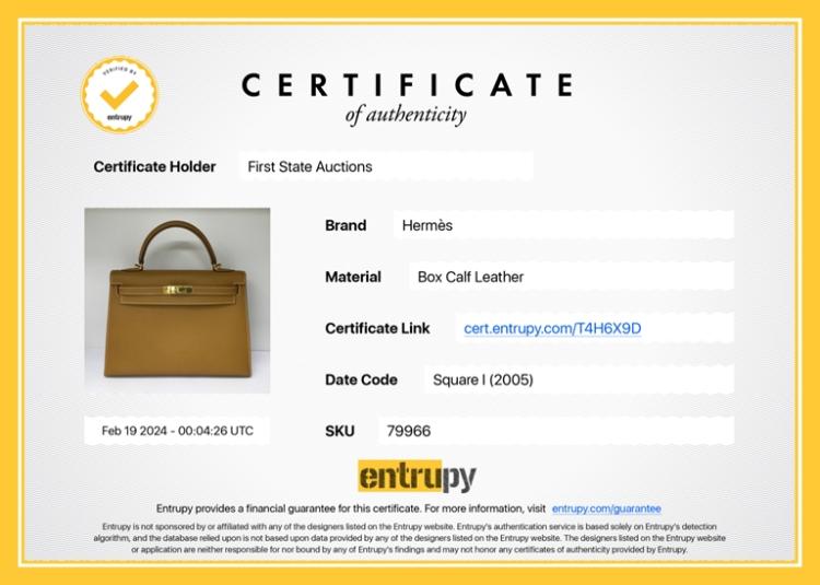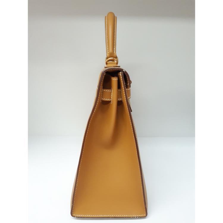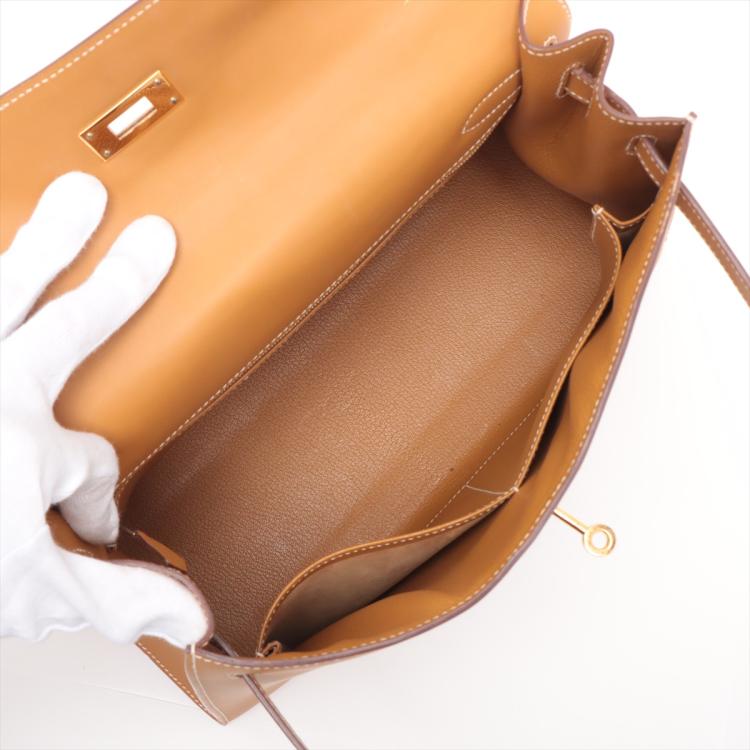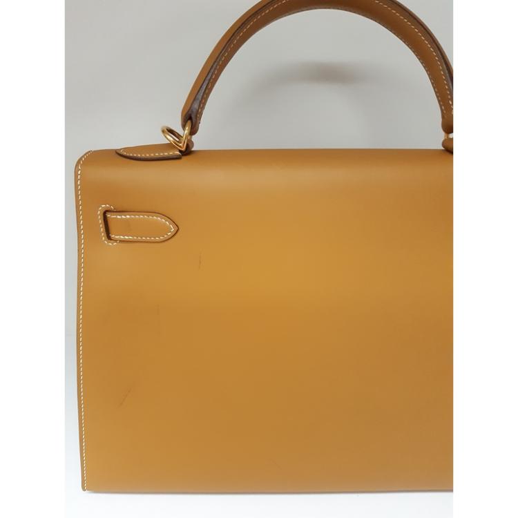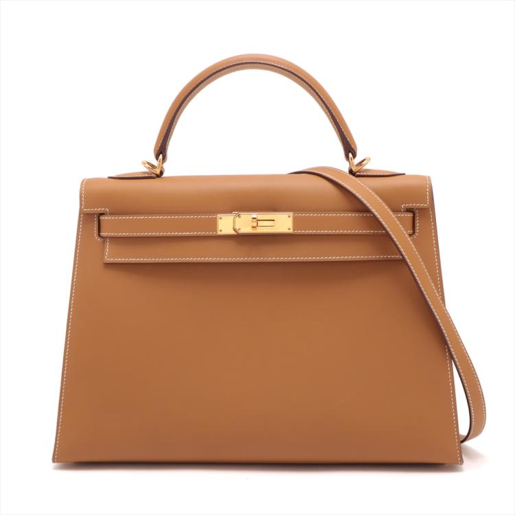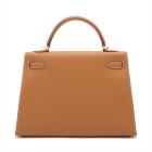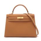 Hermes Sellier Kelly 32 bag in Veau Chamonix leather in gold (Square I, 2005). Gold-toned hardware. Featuring leather top handle, frontal flap, straps and a turn lock closure. The flap opens to a matte leather interior with zipped and flat pockets. Approximate dimensions: 32cm(L) x 22cm(H) x 12cm(D), 9.5cm handle height and 44cm shoulder height. Accompanied by Hermes clochette, keys, padlock, dust bag and box. With Entrupy Certificate of Authenticity. (Pre-owned)