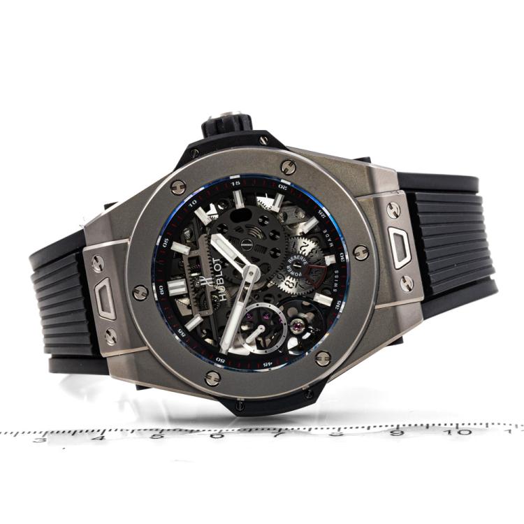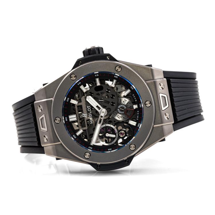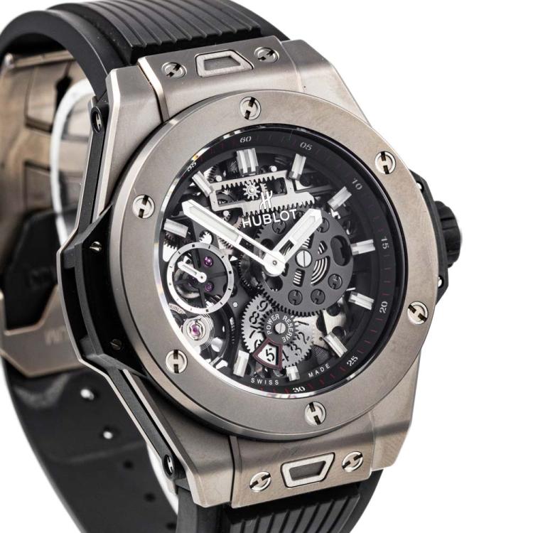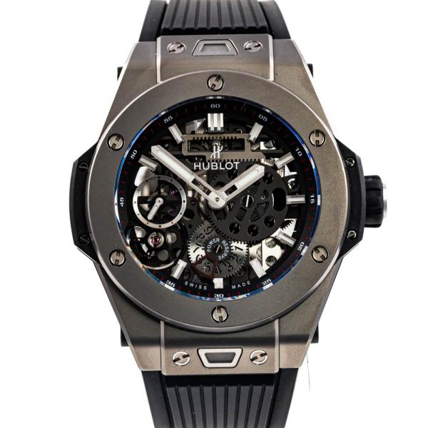 Hublot Big Bang Meca-10 titanium manual winding mens watch. Black Skeleton dial, case diameter: 45mm, adjustable max wrist size: 19.5cm, Swiss made. Ref# 414.NI.1123.RX. With Hublot black rubber strap and clasp. With Certificate of Authenticity and Hublot International warranty card dated 23/04/2021. 3 month FSA warranty (Pre-owned)