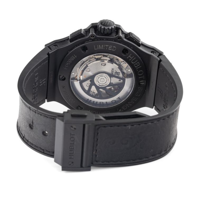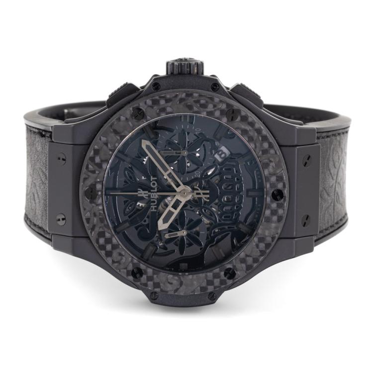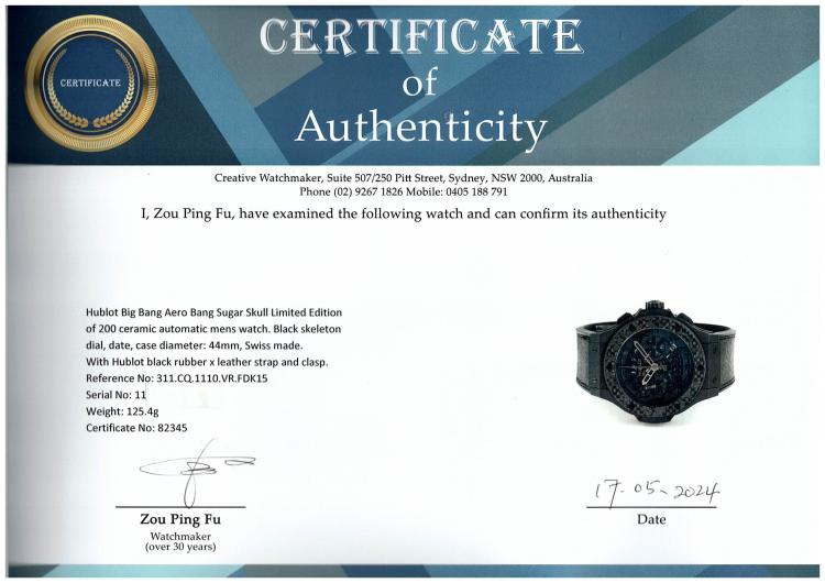 Hublot Big Bang Aero Bang Sugar Skull Limited Edition of 200 ceramic automatic mens watch. Black skeleton dial, date, case diameter: 44mm, adjustable wrist size: 20cm, Swiss made. Ref# 311.CQ.1110.VR.FDK15. With Hublot black rubber x leather strap and clasp. With Certificate of Authenticity, Hublot International Warranty Card. 3 month FSA warranty. (Pre-owned)