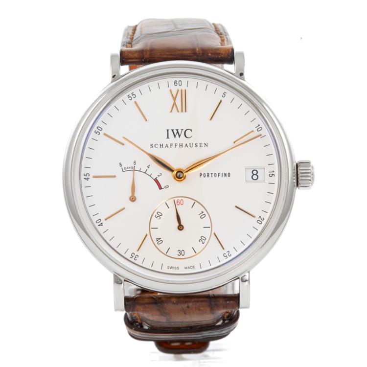 IWC Schaffhausen Portofino stainless steel manual winding mens watch. Silver dial, small second, date, case diameter: 45mm, adjustable max wrist size: 17.5cm, Swiss made. Ref# IW510103. With IWC brown leather strap and clasp. With Certificate of Authenticity, IWC Guarantee card dated 03/12/2013 and IWC box. 3 month FSA warranty (Pre-owned)