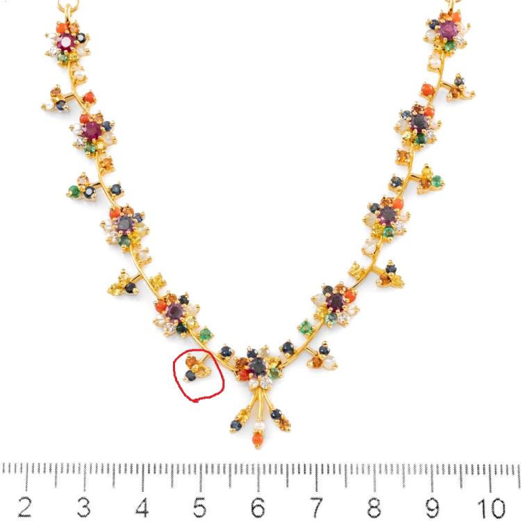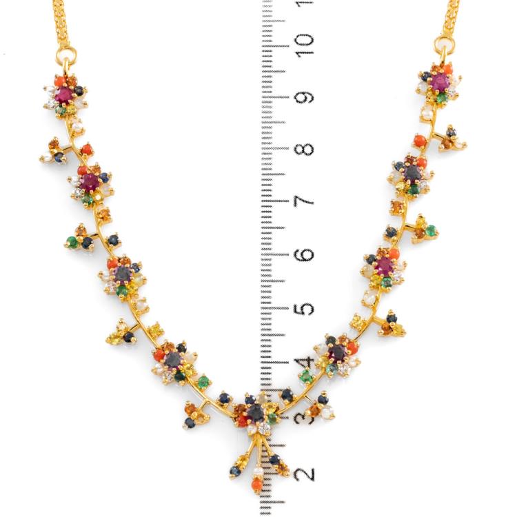 Joyalukkas Navarathna necklace and round natural mixed gemstones (including 9 Rubies totalling approximately 1.80ct and blue Sapphire, Citrine, Emerald, Carnelian, Moonstone & seed Pearl of approximately size 1.9mm - 2.2mm) and 9 round natural Diamonds totalling 0.32ct (Estimated grading: G VS). Adjustable max length: 39cm. 22ct yellow gold with 916 stamp. UAE made. Weight: 28.4g. With Joyalukkas box. With Certificate #418681. (Pre-owned)