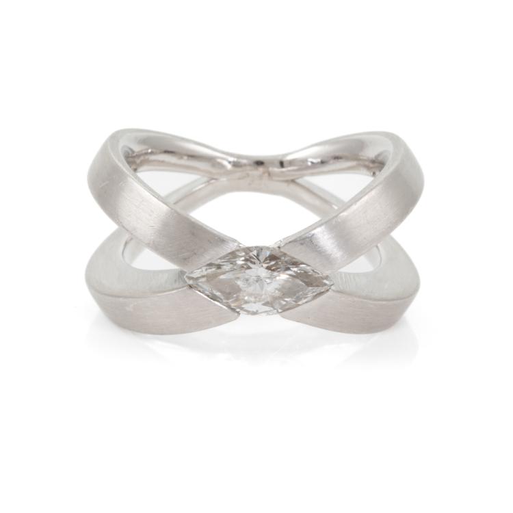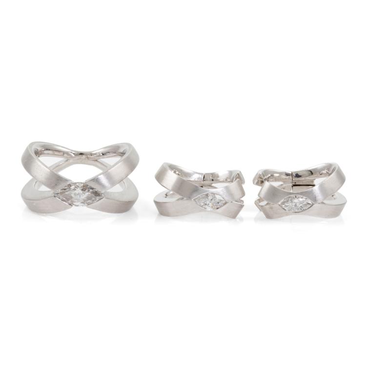 Levendi Millennium ring and earrings set. 1) Ring with a marquise cut natural Diamond of 0.93ct (Estimated grading: G SI). Platinum 950 XRF tested, stamped "Pt"). Ring size P - ring resizing is not recommended. Minimum band width: 2.7mm. 2) Matching earrings with marquise cut natural Diamonds totalling approximately 0.56cts (Estimated grading: G VS). 18ct white gold. Total Weight: 31.6g. With Valuation Certificate #418662. (Pre-owned)
