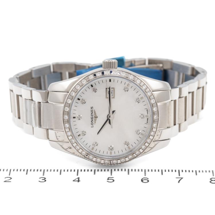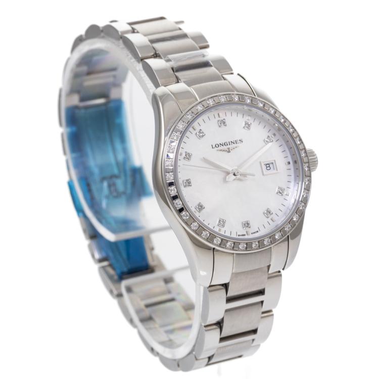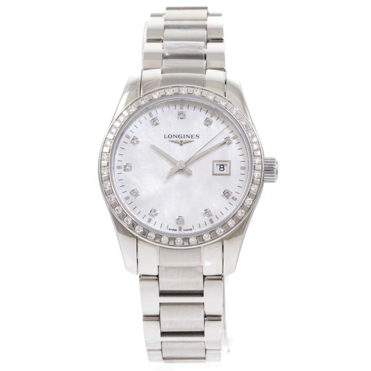 Longines Conquest Classic stainless steel quartz ladies watch. Mother of Pearl dial, Diamond indicators and set bezel, date, case diameter: 29.5cm, Swiss made. Ref# L2.286.0.87.6. With Longines stainless steel bracelet and clasp. With FSA Certificate of Warranty, Longines Diamond Certificate card and Longines box. 3 month FSA warranty (As new, Note: minor scuff and scratches on case and bracelet due to being display stock)