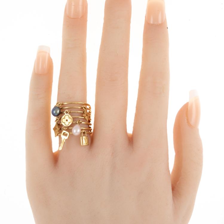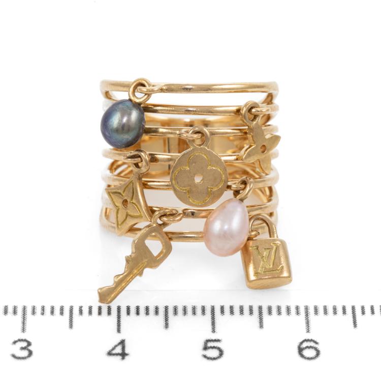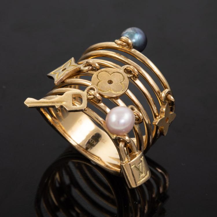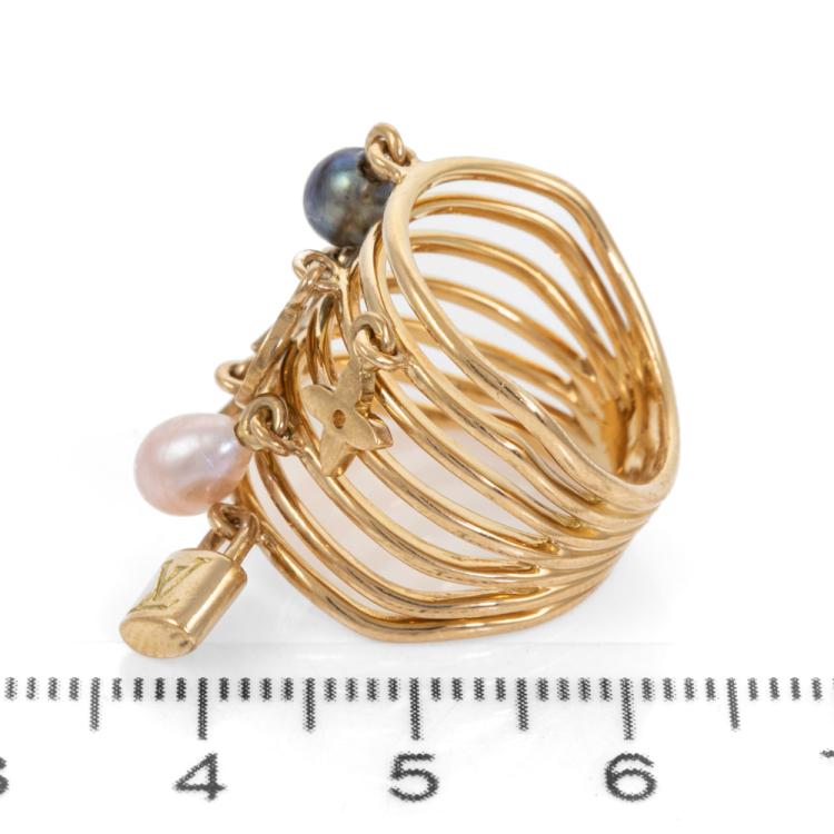 Louis Vuitton Berg Monogram ring with 2 Cultured Pearls of 4.8mm and 5 Louis Vuitton monogram charms. 18ct yellow gold. Stamped size 52, L1/2 - ring resizing is not recommended. Band width: 6.5mm - 10mm. Weight: 10.0g. (Pre-owned)