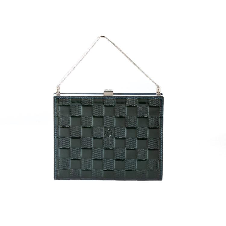 Louis Vuitton Ange PM in Green Damier Vernis patent leather. Featuring silver frame and a silver mesh handle. The top with push-lock closure opens to a green leather lining interior with patched pocket and a card slot. Approximate dimensions: 17cm(L) x 14cm(H) x 2cm(D), 8.5cm handle drop. Accompanied by a metal mirror and a LV dust bag. With Entrupy Certificate of Authenticity. (Pre-owned)