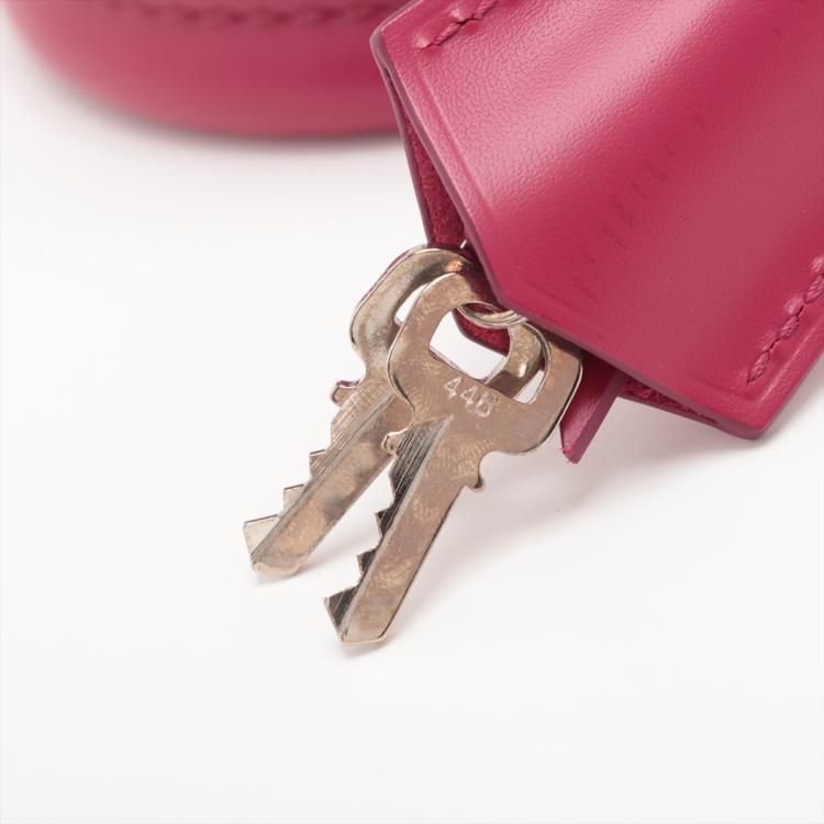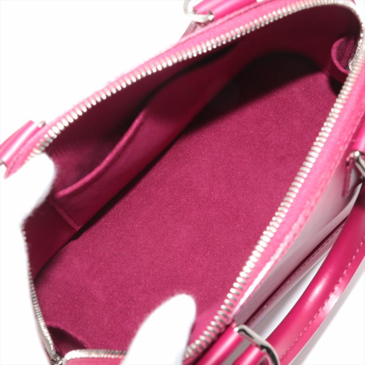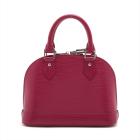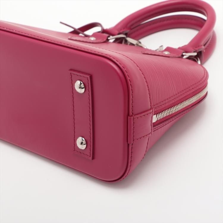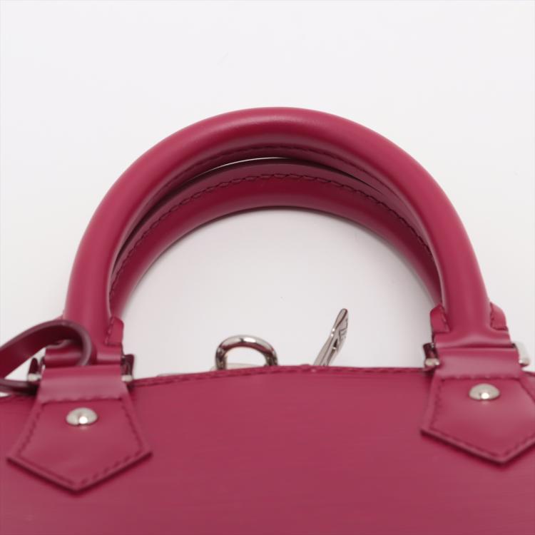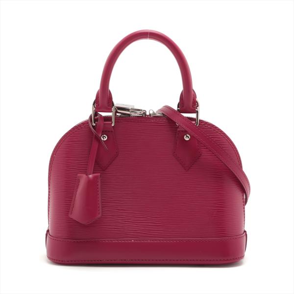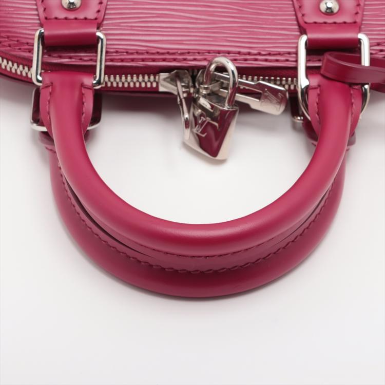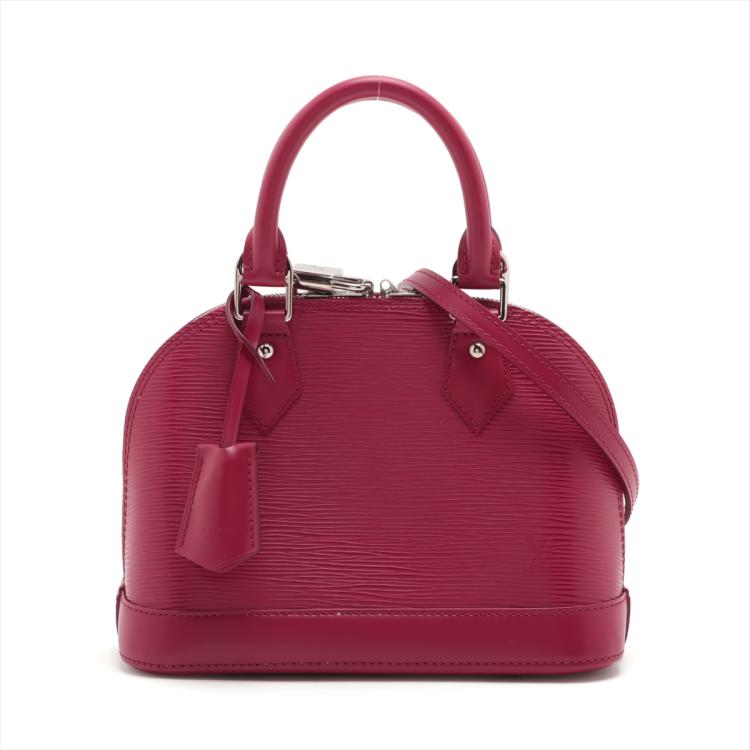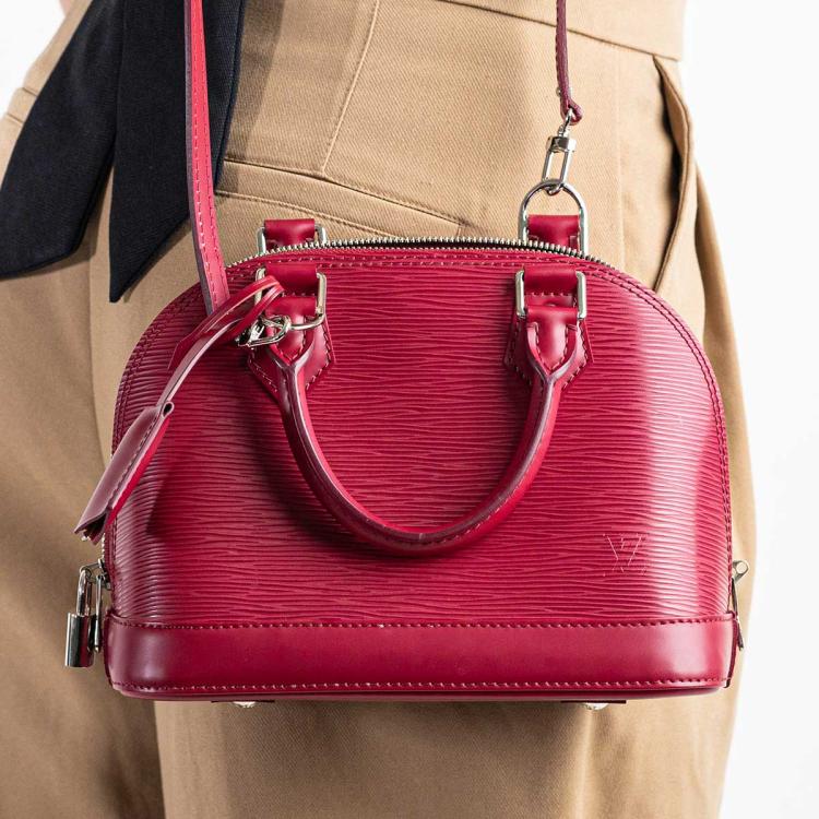 Louis Vuitton Alma BB bag in Burgundy Epi leather. Featuring smooth cowhide-leather trim, silver-toned hardware, dual rolled handles and double zip closure. The top opens to a matching colour microfiber lining interior with a patched pocket. Approximate dimensions: 24cm (L) x 16.5cm (H) x 11.5cm (D), 9cm handle drop and 56cm detachable strap drop. Accompanied by LV padlock, keys, crochet, dust bag & box. With Entrupy Certificate of Authenticity. (Pre-owned)