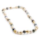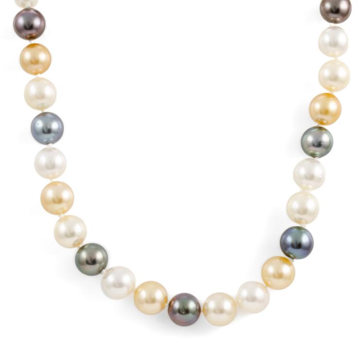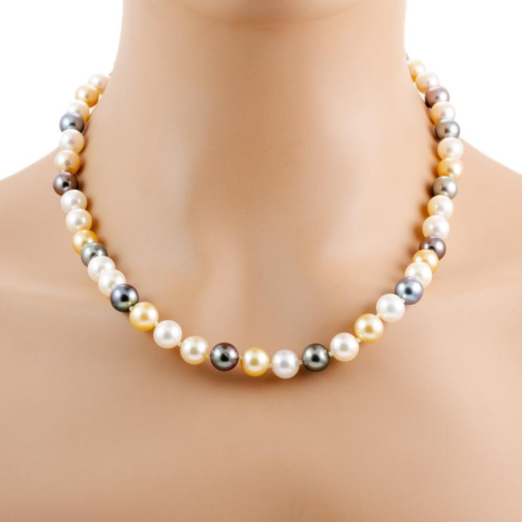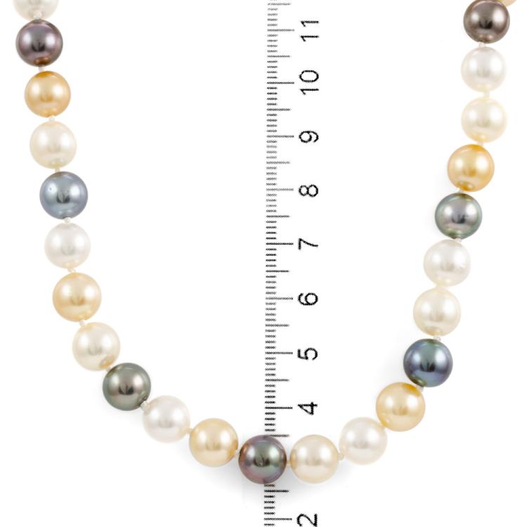 Pearl necklace with 49 white, golden & Tahitian South Sea Pearls of 8.4 - 8.9mm. 14ct yellow gold 9mm ball clasp. Length: 47.5cm. Weight: 45.4g. (Pre-owned)