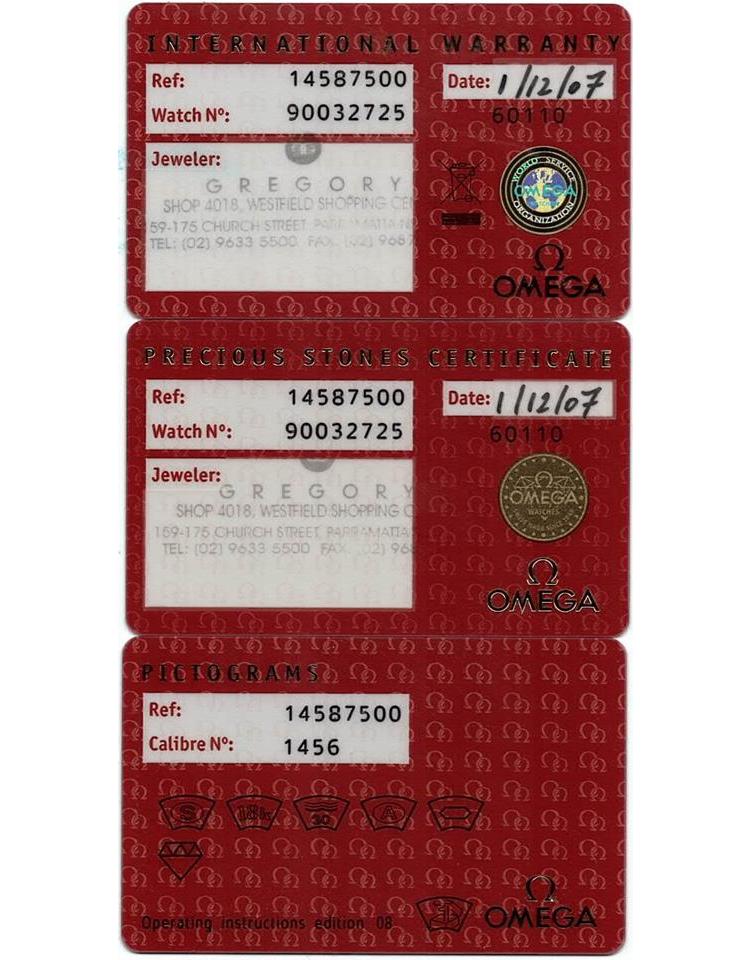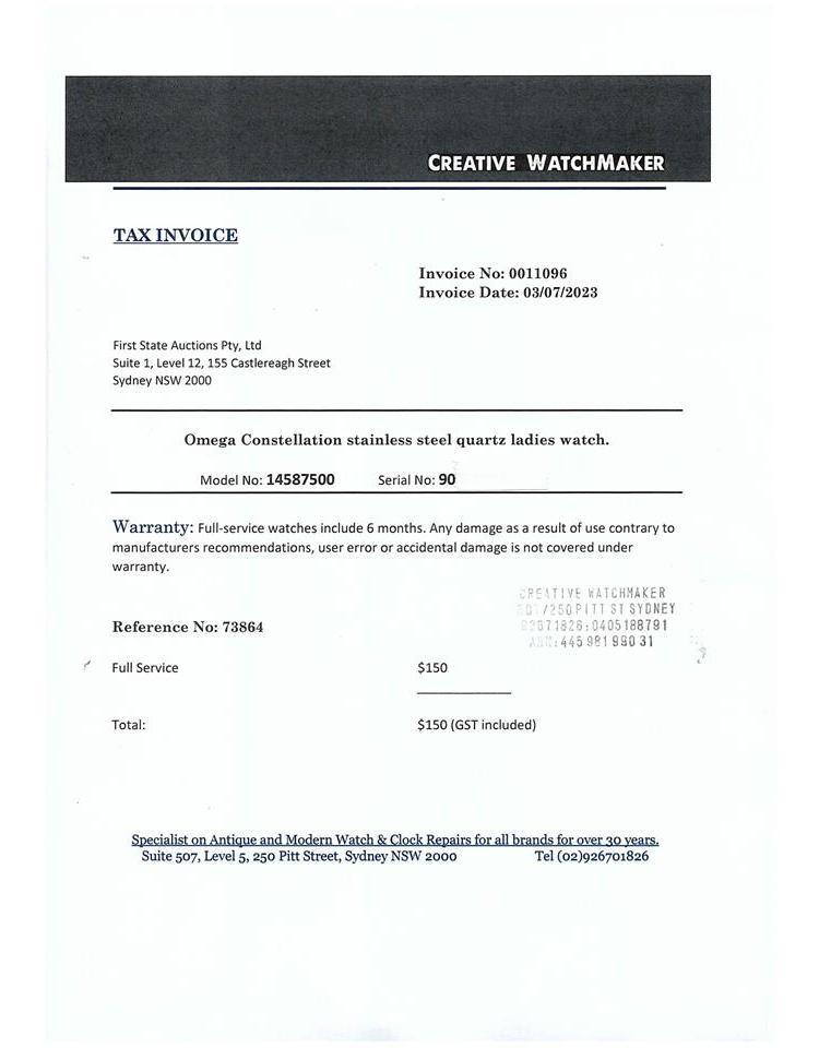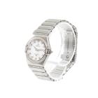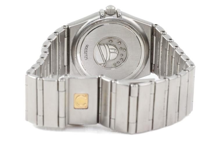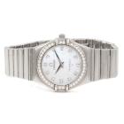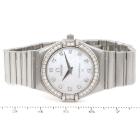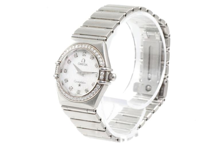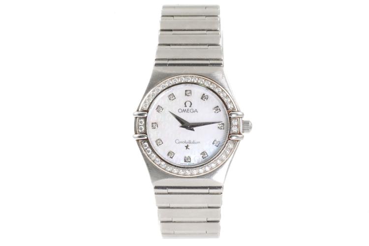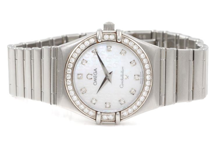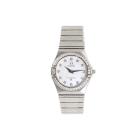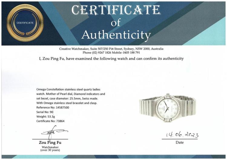 Omega Constellation stainless steel quartz ladies watch. Mother of Pearl dial, Diamond indicators and set bezel, case diameter: 25.5mm, wrist size: 16.5cm, Swiss made. Ref# 14587500. With Omega stainless steel bracelet and clasp. With Certificate of Authenticity, Omega International Warranty Card, Omega Precious Stones Certificate card, Omega Pictograms card and Omega box. With 3 Months FSA Warranty. (Pre-owned)