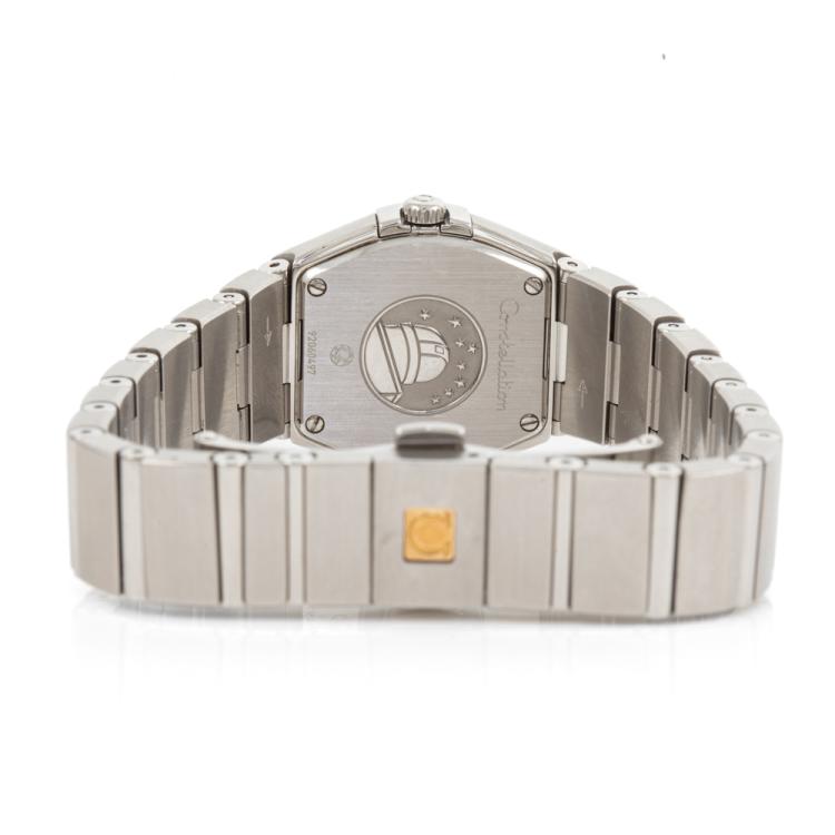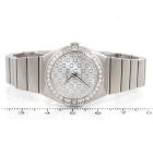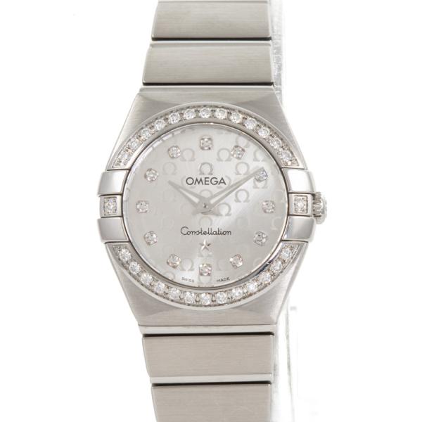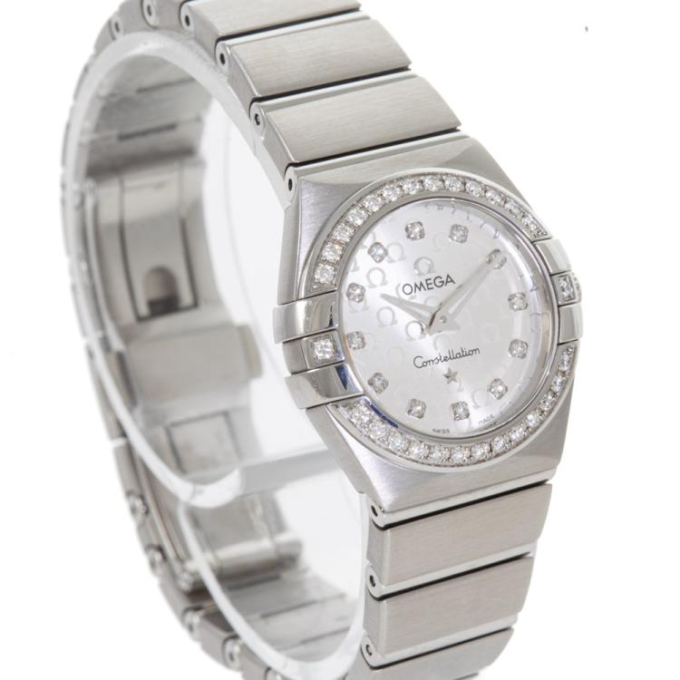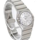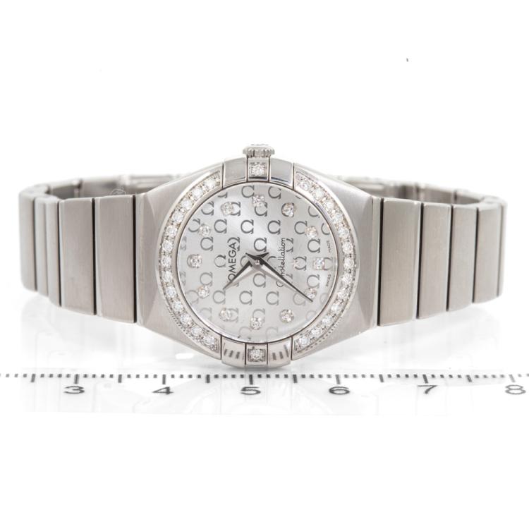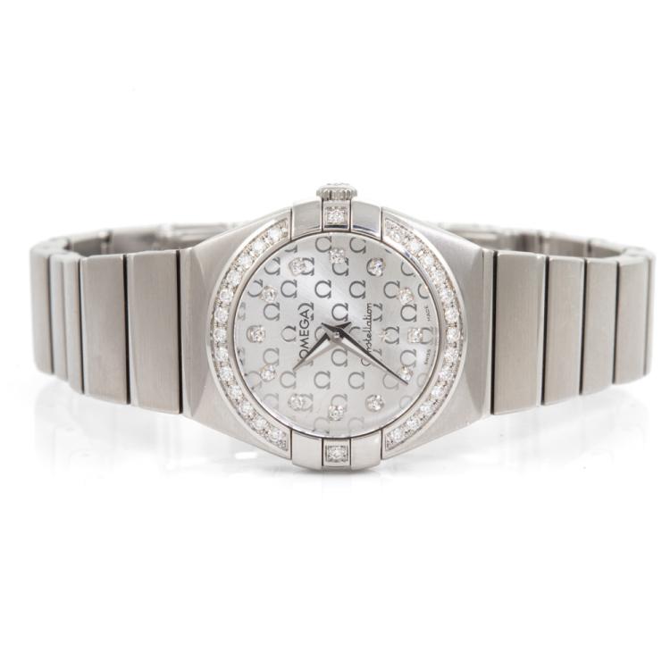 Omega Constellation stainless steel quartz ladies watch. Silver dial, Diamond indicators and set bezel, case diameter: 24mm, wrist size: 15.5cm, Swiss made. Ref# 123.15.24.60.52.001. With Omega stainless steel bracelet and clasp. With Certificate of Authenticity, Undated Omega International warranty card, Omega Pictograms card, Omega Precious stones Certificate card and Omega box. 3 month FSA warranty (Pre-owned)