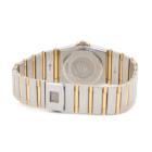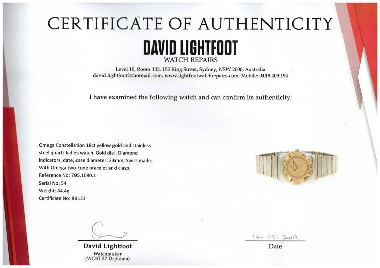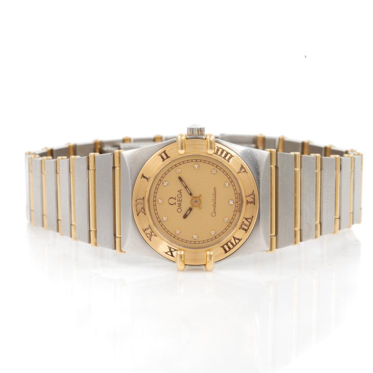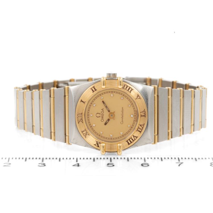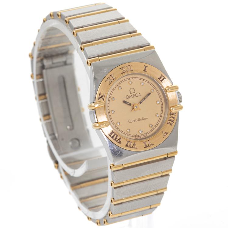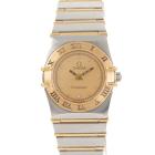 Omega Constellation 18ct yellow gold and stainless steel quartz ladies watch. Gold dial, Diamond indicators, date, case diameter: 23mm, wrist size: 15cm, Swiss made. Ref# 795.1080.1. With Omega two-tone bracelet and clasp. With Certificate of Authenticity and Omega box. 3 month FSA warranty (Pre-owned)