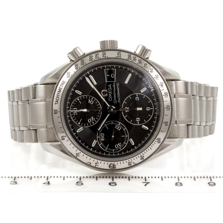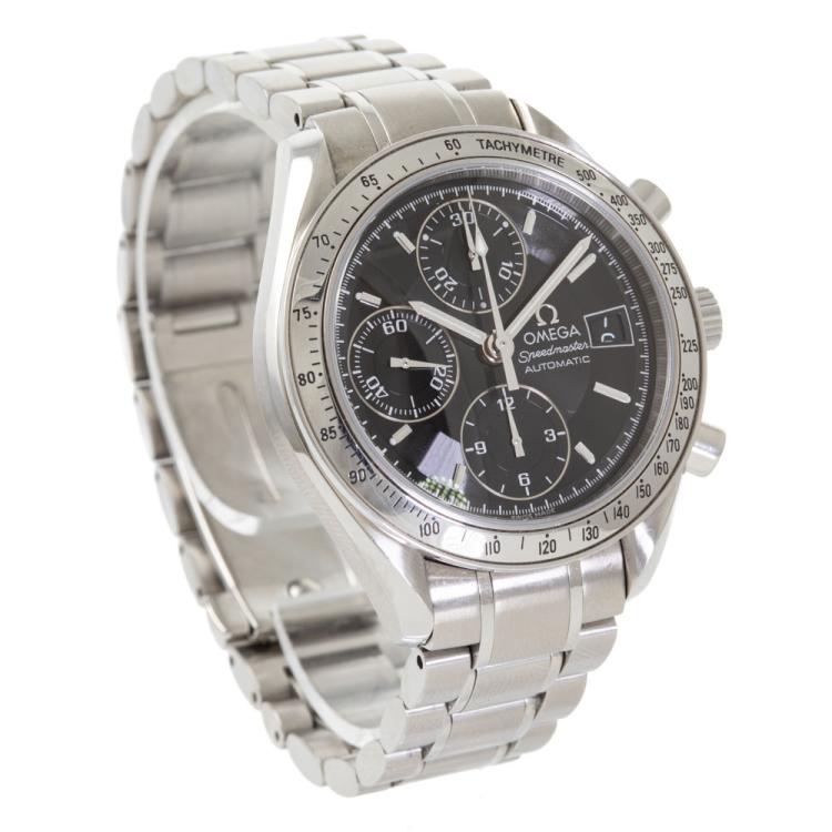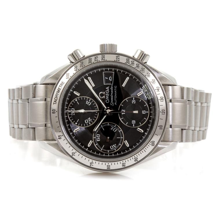 Omega Speedmaster Date stainless steel automatic mens watch. Black chronograph dial, date, case diameter: 39mm, wrist size: 17.5cm, Swiss made. Ref# 3513.50. With Omega stainless steel bracelet and clasp. With Certificate of Authenticity. 3 month FSA warranty (Pre-owned)