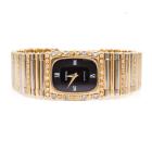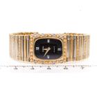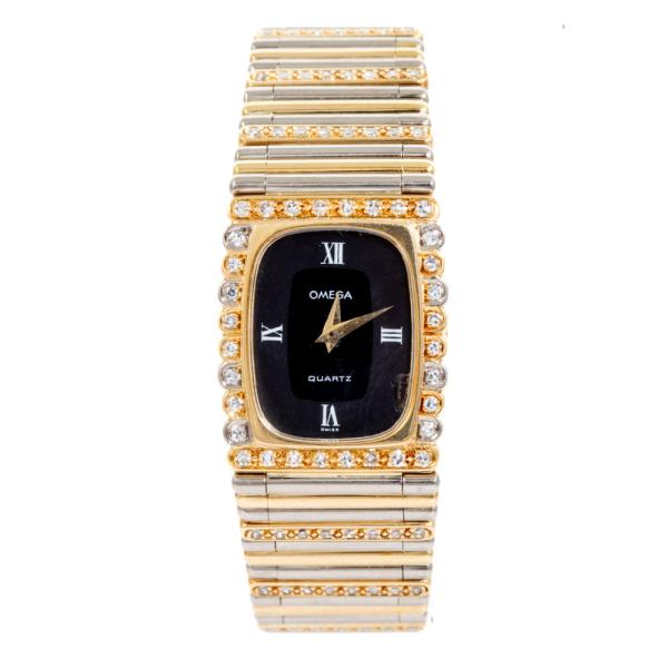 Omega Vintage 18ct yellow & white gold ladies quartz watch. Black dial, Diamond set bezel, approx. case diameter: 22mmx 19mm, wrist length: 16cm, Swiss made. With Omega two-tone Diamond set bracelet and clasp. With Certificate of Authenticity and Omega case. No warranty applies. (Pre-owned)