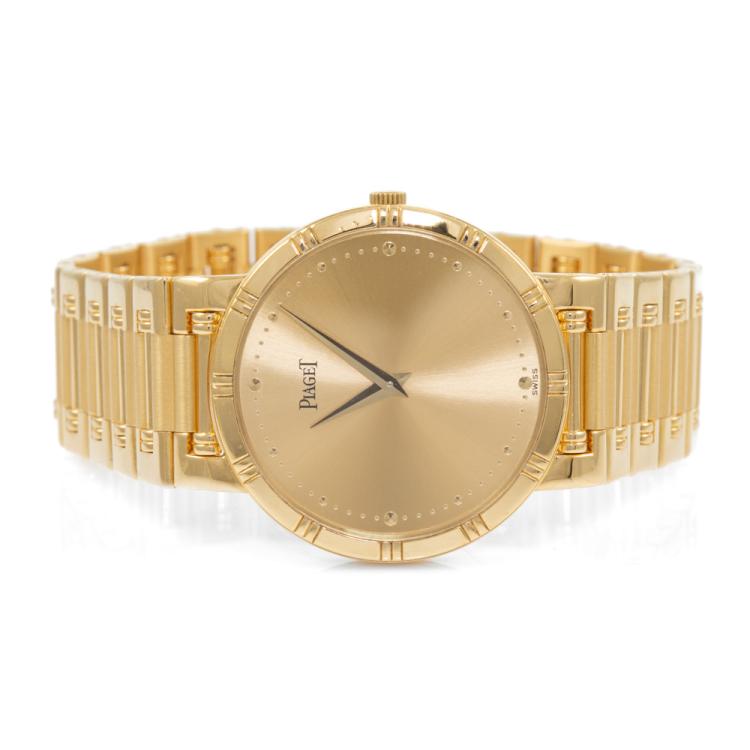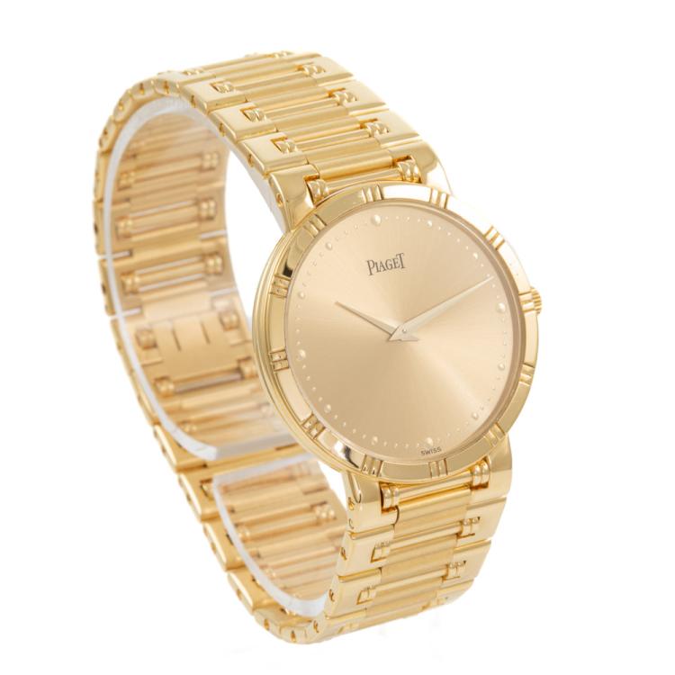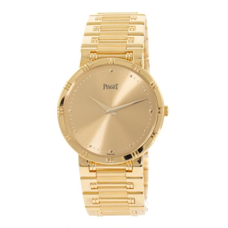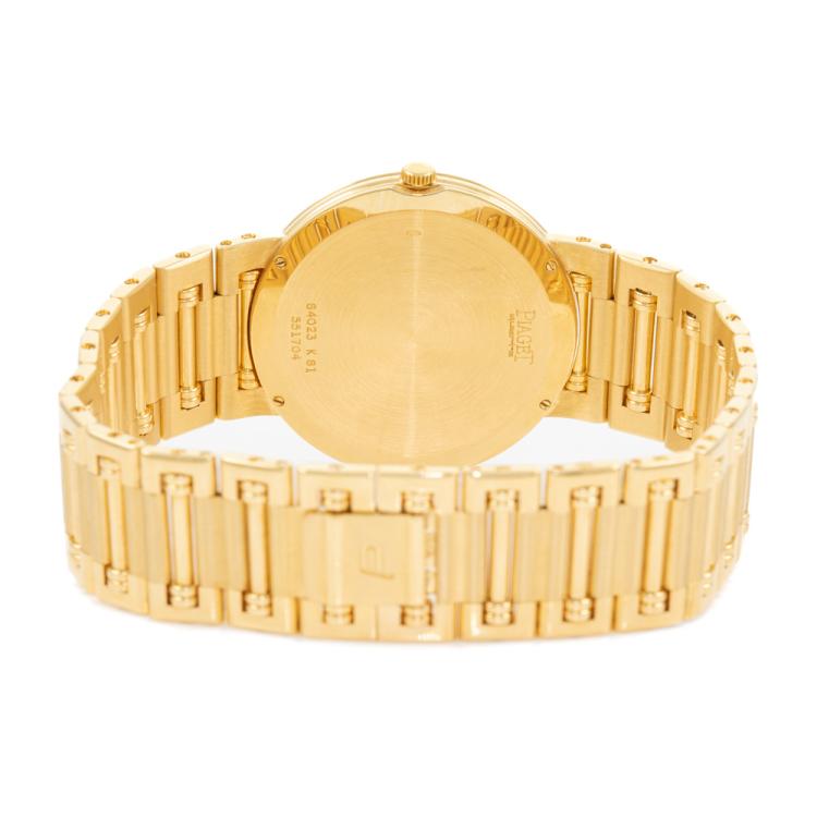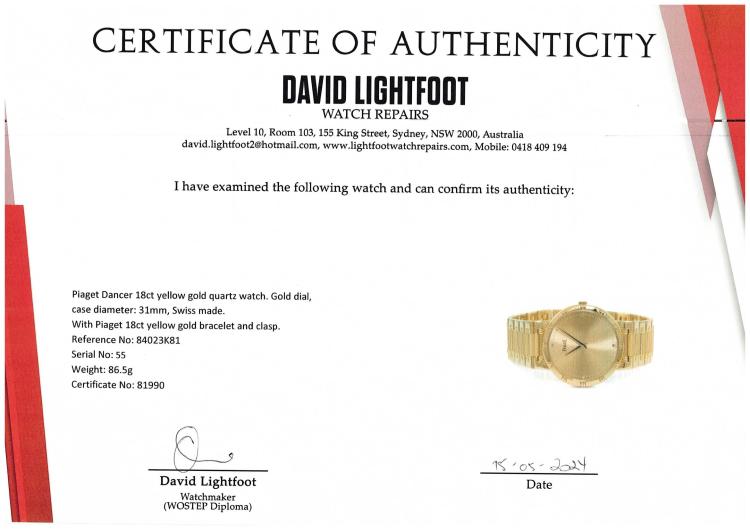 Piaget Dancer 18ct yellow gold quartz watch. Gold dial, case diameter: 31mm, wrist size: 17.4cm, Swiss made. Ref# 84023K81. With Piaget 18ct yellow gold bracelet and clasp. With Piaget Pouch and Certificate of Authenticity. 3 month FSA warranty. (Pre-owned)