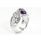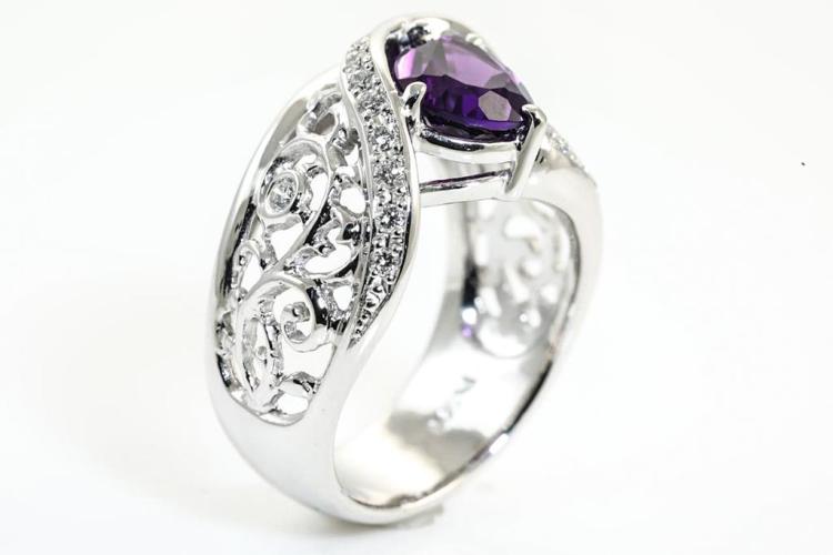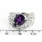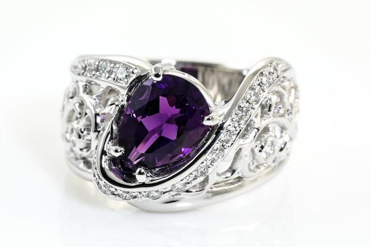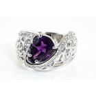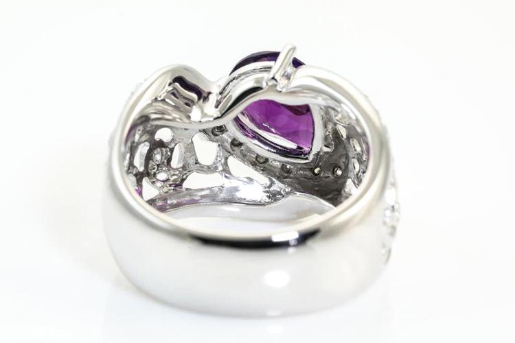 Amethyst and Diamond ring with pear shape Natural Amethyst of 1.70ct and Natural Diamonds totalling 0.25cts. Platinum-900. Ring size M1/2 - cannot be resized up, down with ring clip. Weight: 14.9g (Pre-owned).