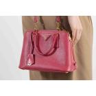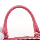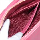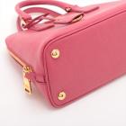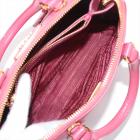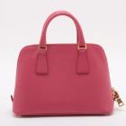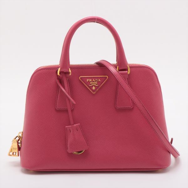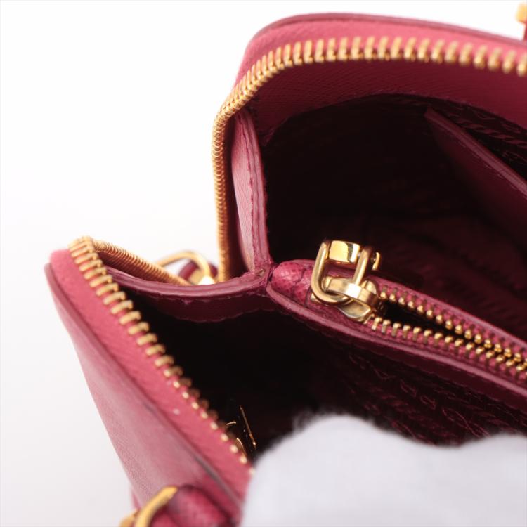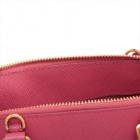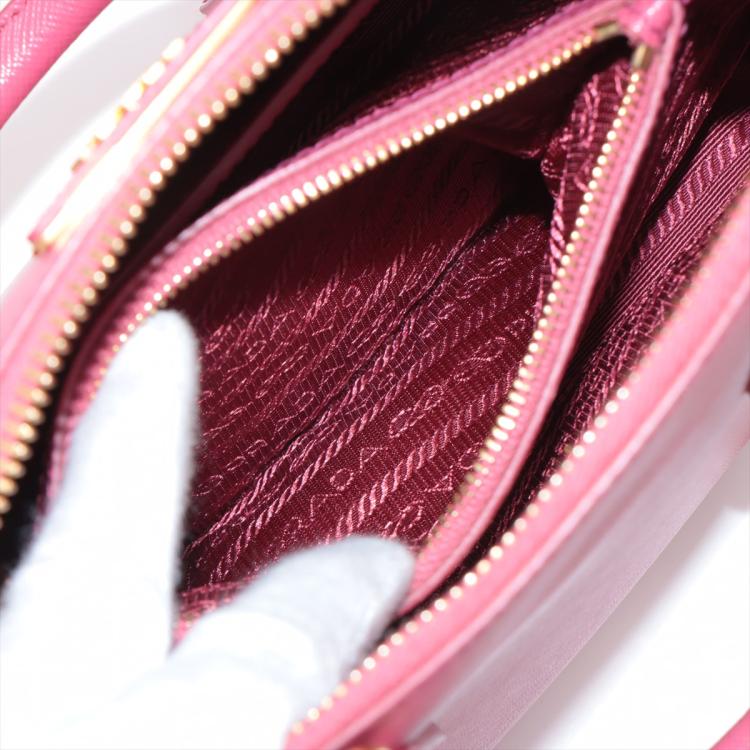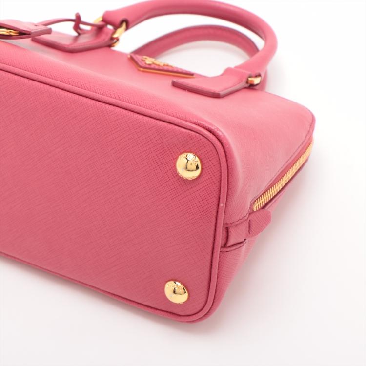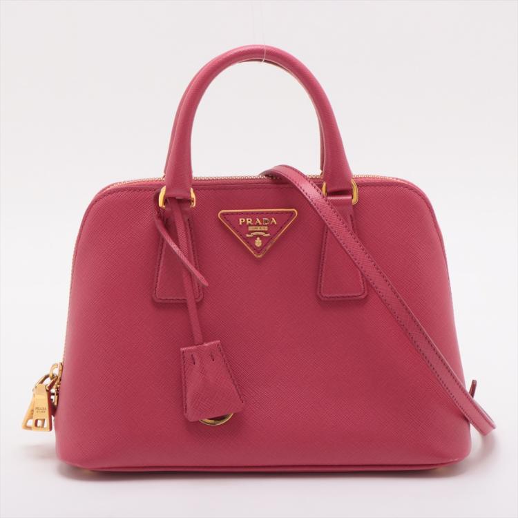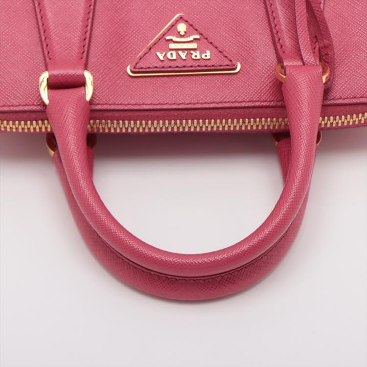 Prada small Promenade bag in pink Saffiano leather. Featuring gold tone hardware, rolled leather top handles with brass links, leather logo plate on front. The 2-way zipper closure opens to a nylon lining interior with 2 compartments and a zipper pocket in the middle. Approximate dimensions: 25.5cm(L) x 17cm(H) x 11.5cm(D), 7.5cm handle drop and 63cm shoulder strap drop. Accompanied by a clochette with keyring. With Entrupy Certificate of Authenticity. (Pre-owned)
