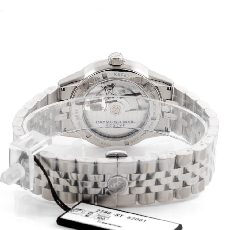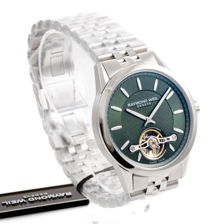 Raymond Weil Freelancer stainless steel automatic mens watch. Green dial, case diameter: 42mm, wrist size: 21cm, Swiss made. Ref# 2780-ST-52001. With Raymond Weil stainless steel bracelet and clasp. With Raymond Weil Guarantee Certificate card and Raymond Weil box. 12 month FSA warranty (As new, Note: case and bracelet on original wrapping)
