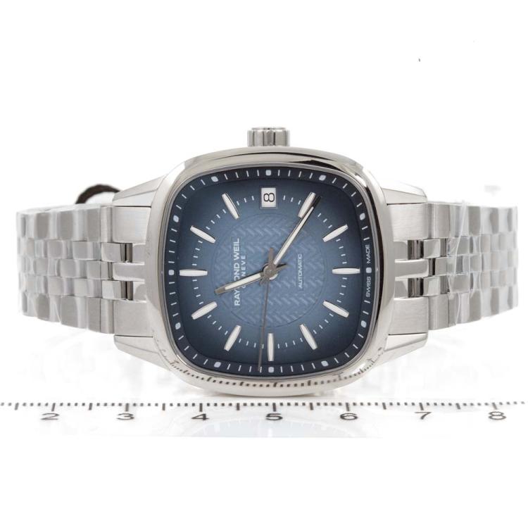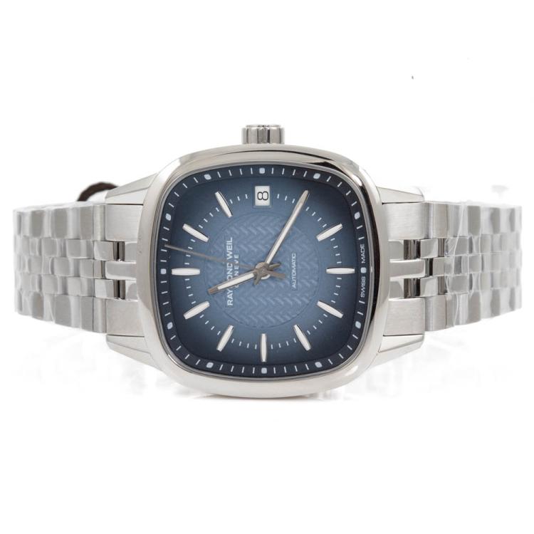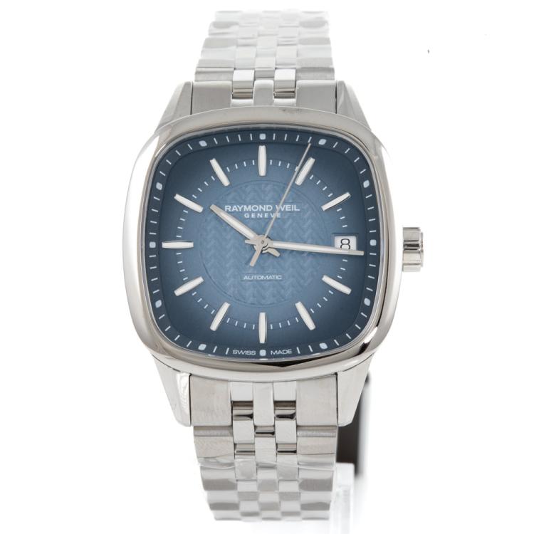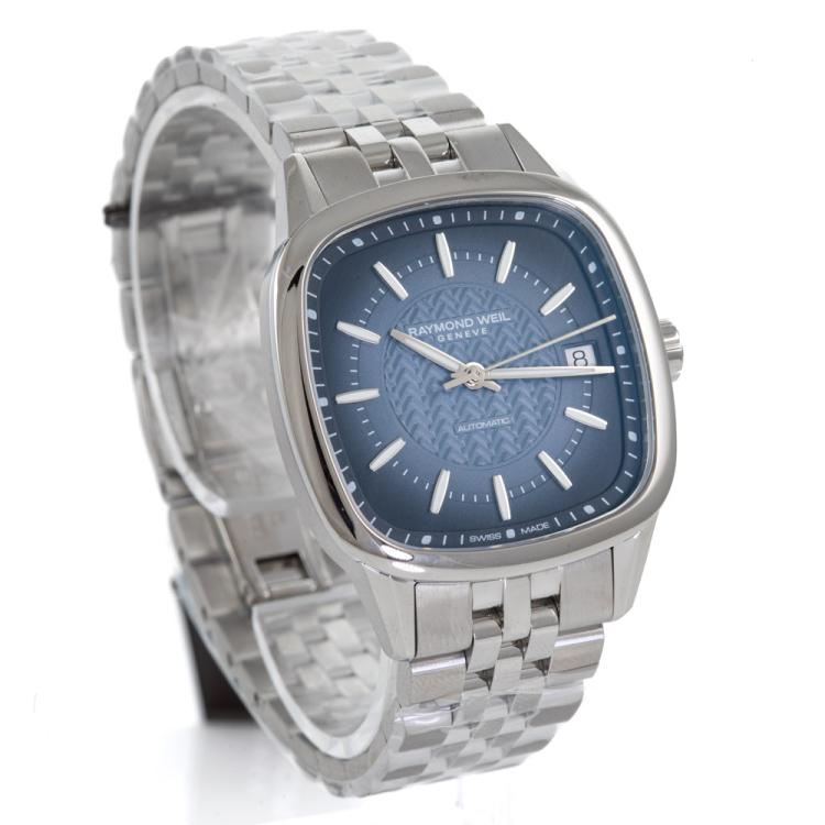 Raymond Weil Freelancer stainless steel automatic watch. Blue dial, date, case diameter: 34.5cm, wrist size: 18.5cm, Swiss made. Ref# 2490-ST-50051. With Raymond Weil stainless steel bracelet and clasp. With Raymond Weil Guarantee card and Raymond Weil box. 12 month FSA warranty (As new, Note: case and bracelet on original wrapping)