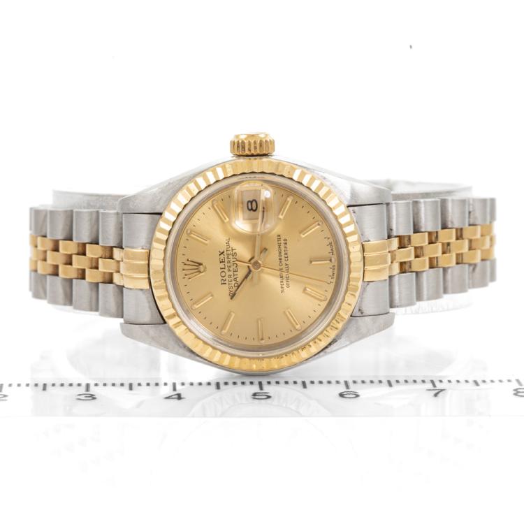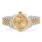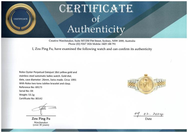 Rolex Oyster Perpetual Datejust 18ct yellow gold and stainless steel automatic ladies watch. Gold dial, date, case diameter: 26mm, wrist size: 15cm, Swiss made. Ref# 69173. Circa: 1991. With Rolex two tone Jubilee bracelet and clasp. With Certificate of Authenticity and Rolex box with Rolex gift bag. 3 month FSA warranty (Pre-owned)