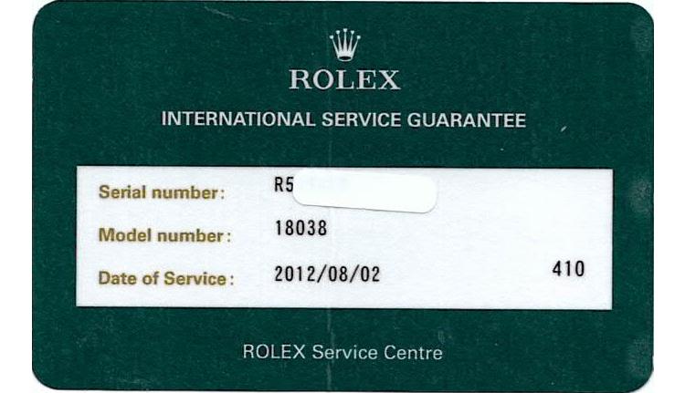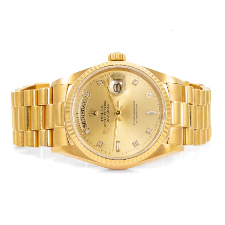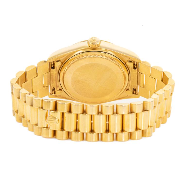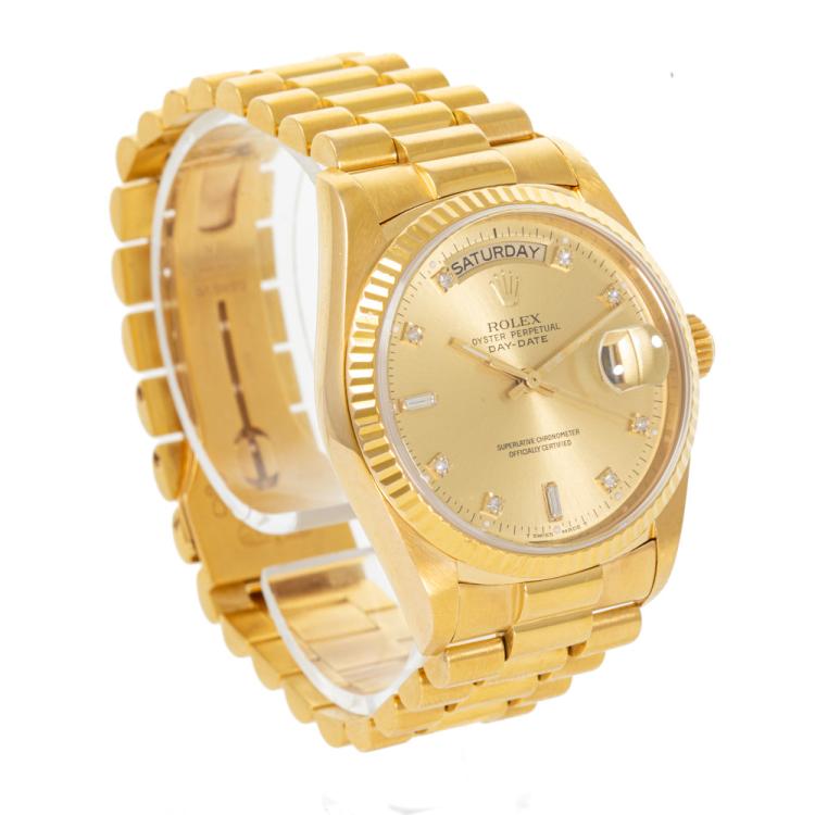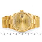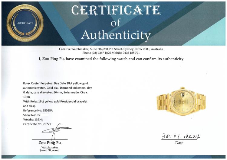 Rolex Oyster Perpetual Day Date 18ct yellow gold automatic watch. Gold dial, Diamond indicators, day & date, case diameter: 36mm, wrist size: 18cm, Swiss made. Ref# 18038A. Circa: 1988. With Rolex 18ct yellow gold Presidential bracelet and clasp. With Certificate of Authenticity, Rolex International Service Guarantee card dated 02/08/2012 and Rolex box. 3 month FSA warranty (Pre-owned)