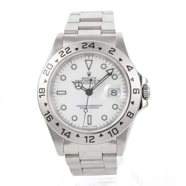Rolex Oyster Perpetual Explorer II stainless steel automatic mens watch. White dial, date, case diameter: 40mm, wrist size: 18cm, Swiss made. Ref# 16570. Circa: 1997. With Rolex stainless steel Oyster bracelet and clasp. With Certificate of Authenticity and Rolex box. 3 month FSA warranty (Pre-owned)