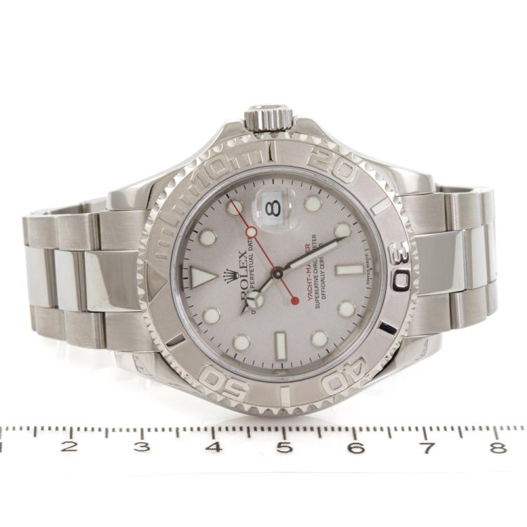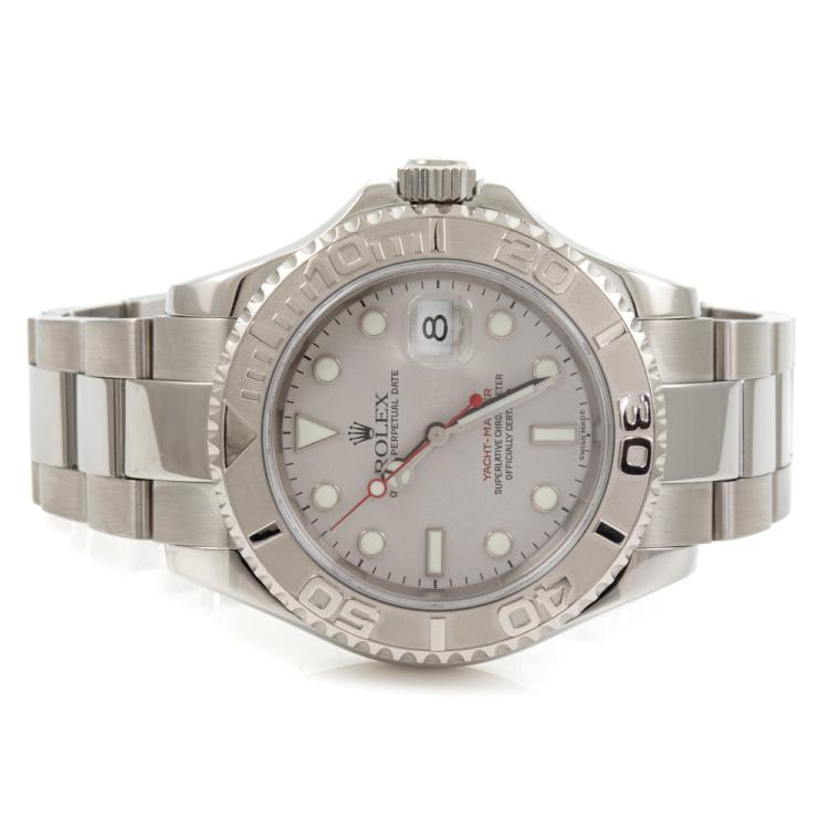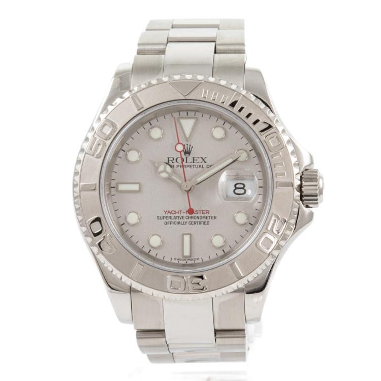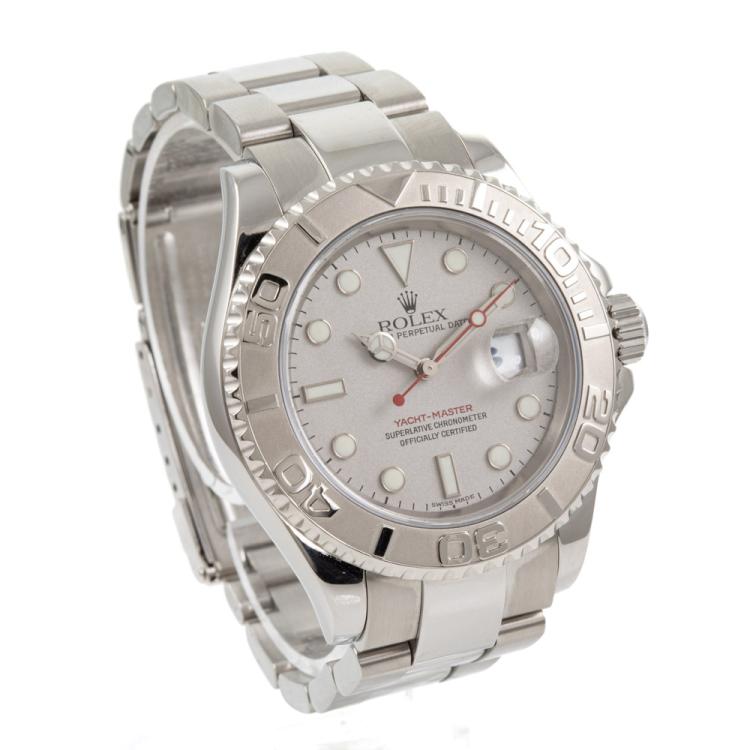 Rolex Yacht Master stainless steel automatic mens watch. Silver dial, date, case diameter: 40mm, wrist size: 17.5cm, Swiss made. Ref# 16622. Circa: 2001. With Rolex stainless steel Oyster bracelet and clasp. With Certificate of Authenticity and Rolex case. 3 month FSA warranty. (Pre-owned)