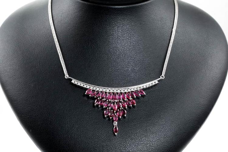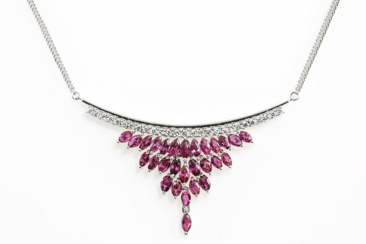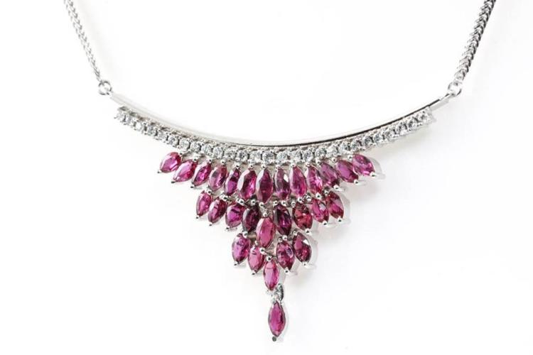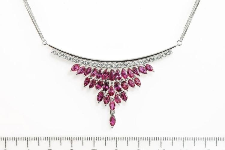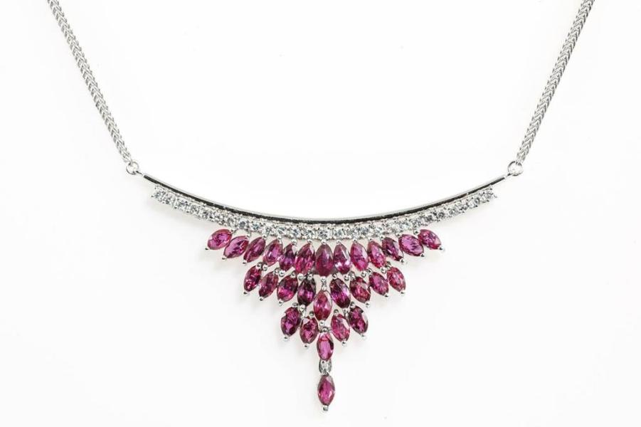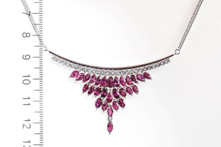 Ruby and Diamond necklace with marquise cut Natural Rubies totalling 5.74cts and round Natural Diamonds totalling 0.58cts (Estimated grading: G SI). Platinum - 900. Length: 44cm. Weight: 21.7g. (Pre-owned)