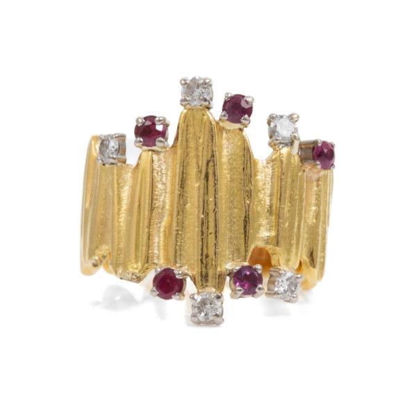 Ruby and Diamond fancy ring with round natural Rubies totalling approx. 0.25cts and round natural Diamonds totalling 0.20cts. 18ct yellow and white gold. Ring size L - ring resizing is not recommended. Band width: 7.4mm - 10.5mm. Weight: 8.8g. (Pre-owned)