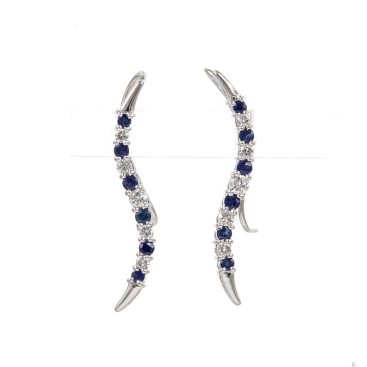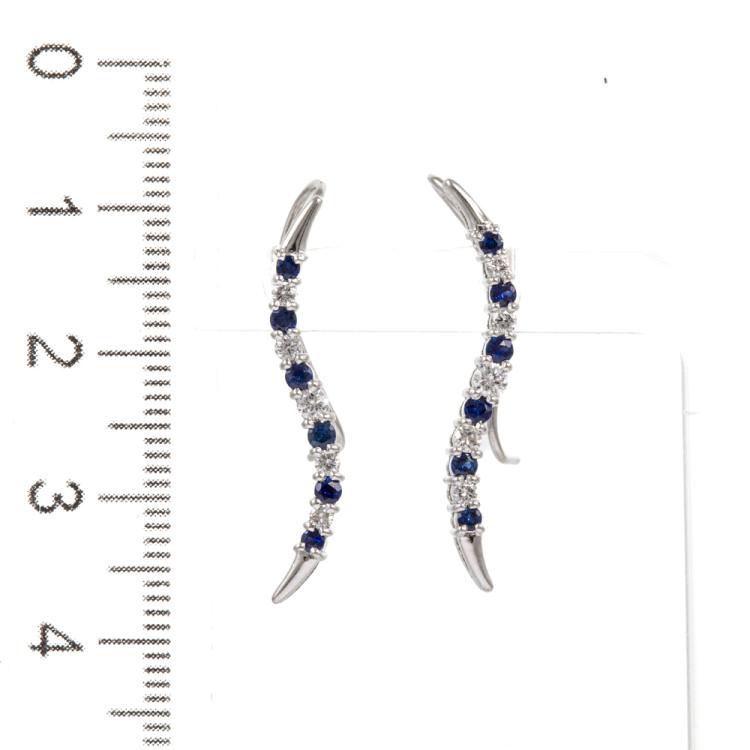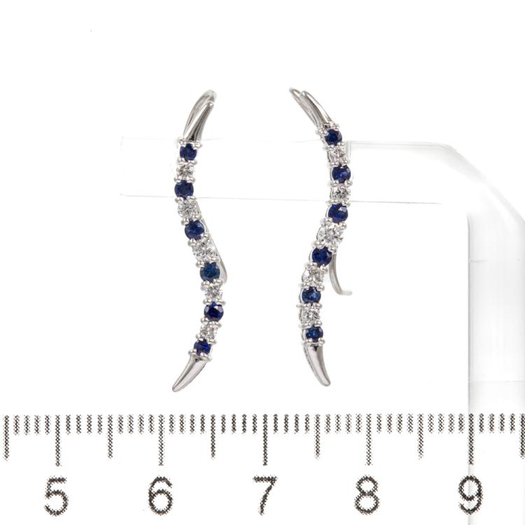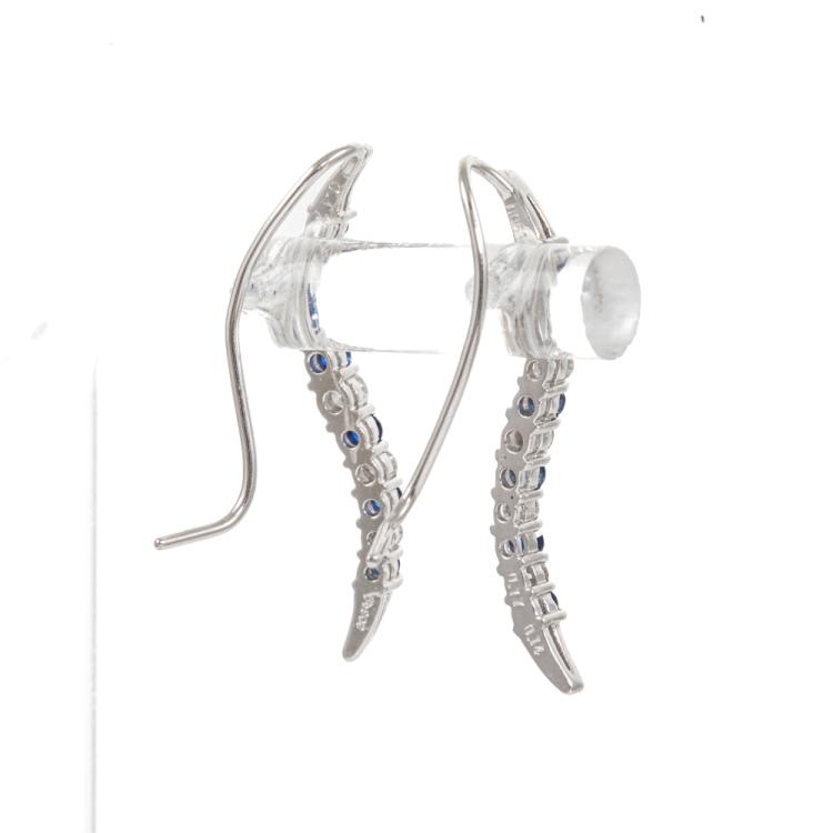 Sapphire and Diamond shepherd hook earrings with round Natural blue Sapphires totalling 0.34cts and round Natural Diamonds totalling 0.28cts. Platinum 900. Length: 2.8cm. Weight: 3.5g. (Pre-owned)