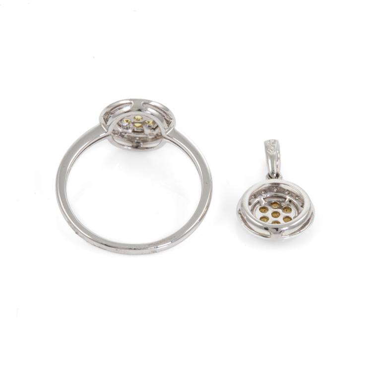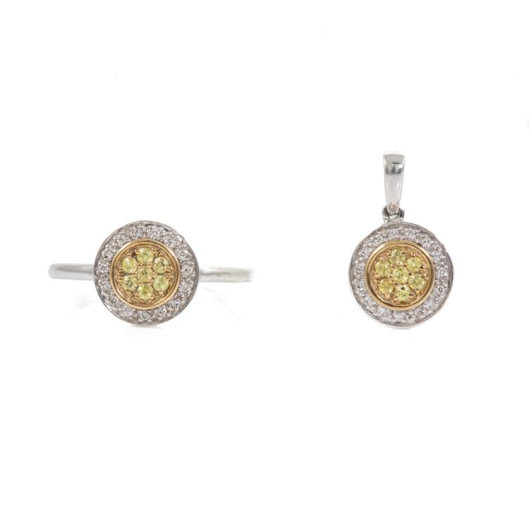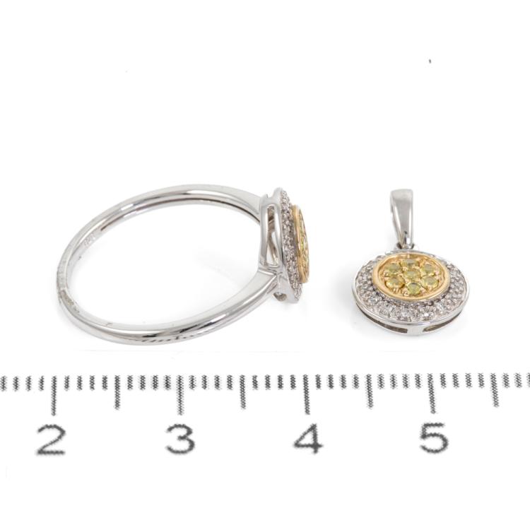 Two piece Yellow Sapphire set: 1) Sapphire and Diamond ring with round yellow Natural Sapphires totalling approx. 0.10cts and round Natural Diamonds totalling approx. 0.15cts. Ring size L. Band width: 1.4mm - 1.5mm. 2) Sapphire and Diamond pendant with round yellow Natural Sapphires totalling 0.07cts and round Natural Diamonds totalling 0.10cts. 9ct white and yellow gold. No chain provided. All 9ct yellow & white gold. Total weight: 2.6g (As new)