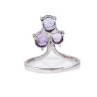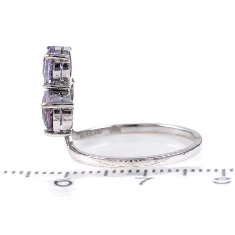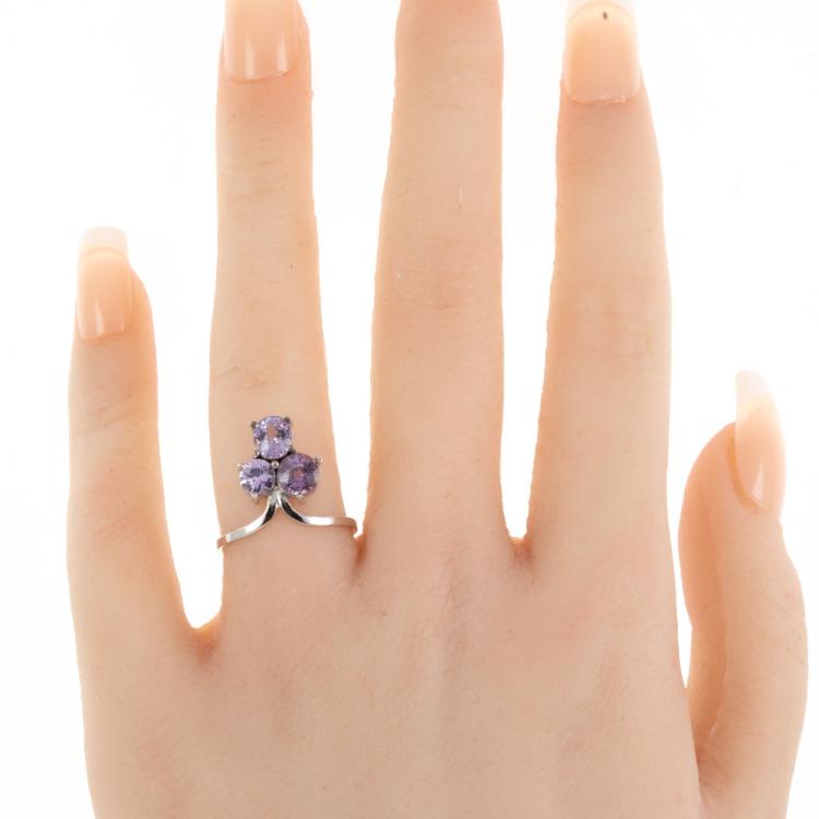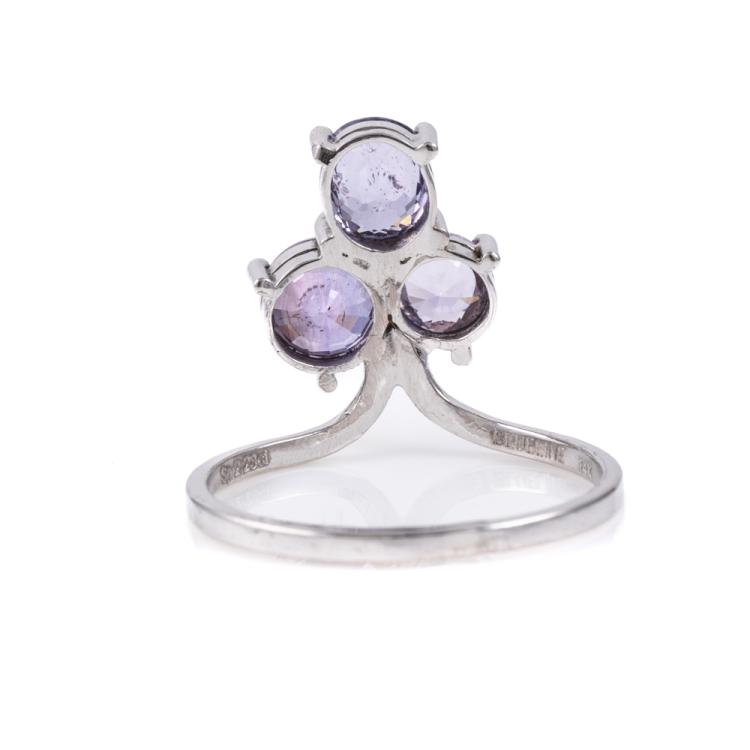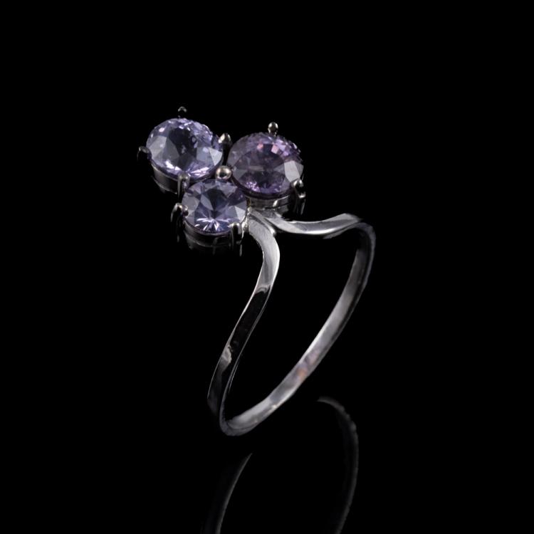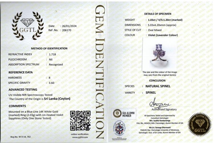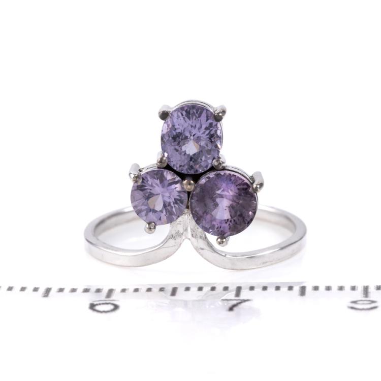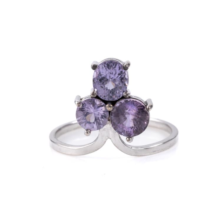 Ring with an oval shape violet Ceylon Natural Spinel of 1.03ct and 2 round unheated Violet Natural Sapphires totalling 1.20cts (Note: only 1 Sapphires tested). 14ct white gold. Ring size K3/4. Band width: 1.3mm. Weight: 2.0g. With GGTL Report #206170. (As new)