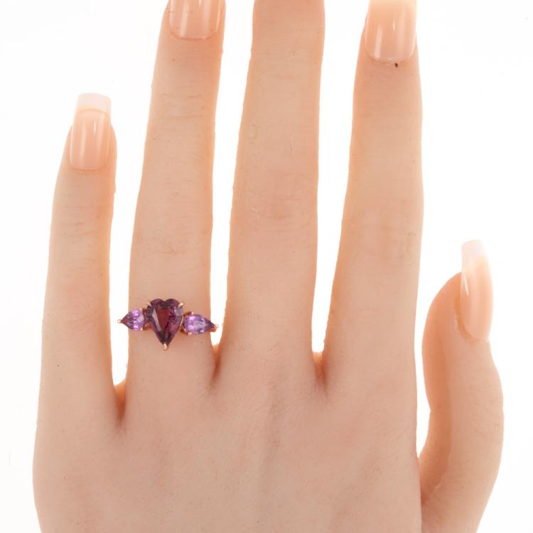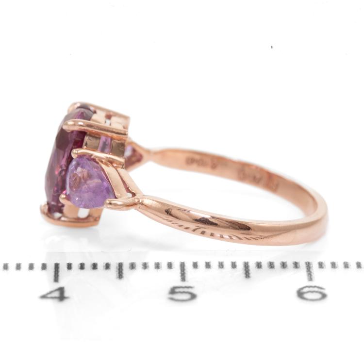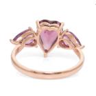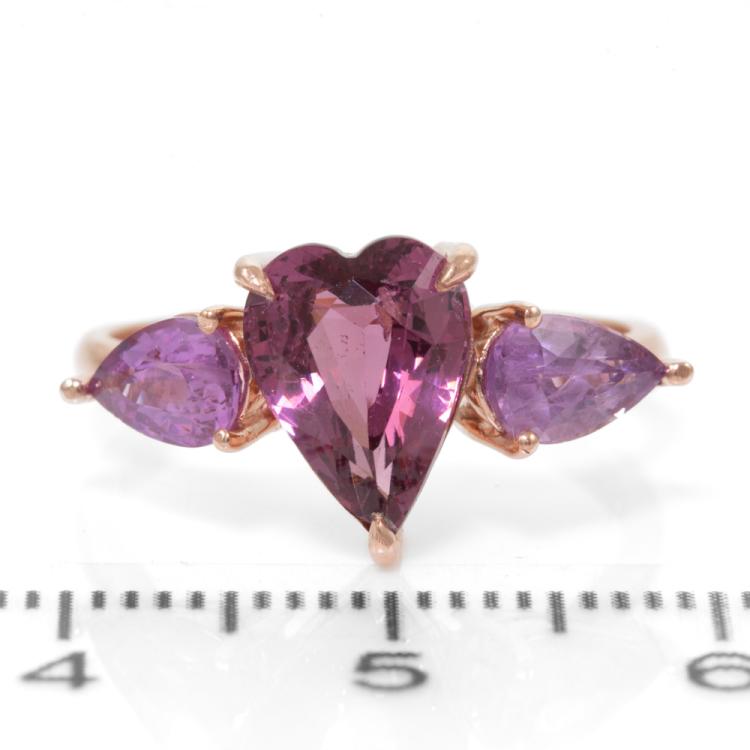 Spinel and Sapphire ring with a heart shape purplish pink Ceylon Natural Spinel of 2.16ct and pear shape unheated pink Natural Sapphires totalling 1.21cts. 14ct rose gold. Weight: 2.7g. Band width: 2mm. Ring size L1/2. Band width: 2.1mm - 1.9mm. With GGTL report #195851. (As new)