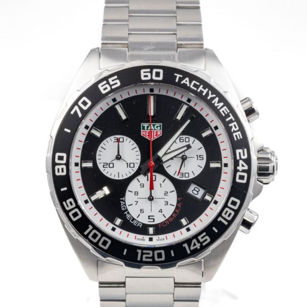 TAG Heuer Formula 1 stainless steel quartz mens watch. Black chronograph dial, date, case diameter: 43mm, wrist size: 20cm, Swiss made. Ref# CAZ101E. With TAG Heuer stainless steel bracelet and clasp. With Certificate of Authenticity and TAG Heuer box. 3 month FSA warranty (Pre-owned)