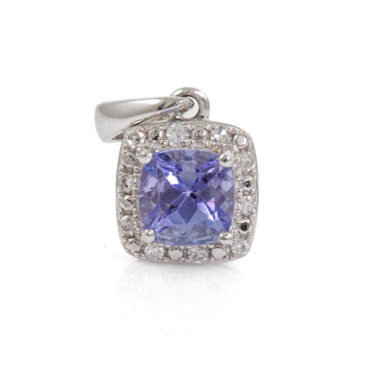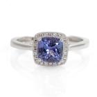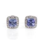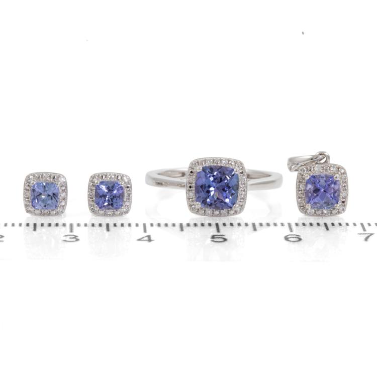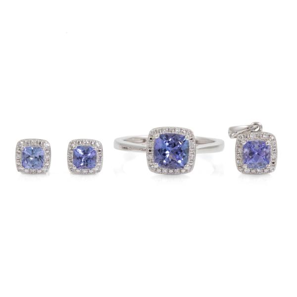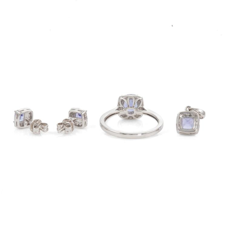 Three piece Tanzanite set incl. 1) Tanzanite ring with cushion cut Natural Tanzanite of approx. 1.02cts & Natural Diamonds totalling 0.15cts. Ring size L. Band width: 1.8-1.1mm. 2) Tanzanite earrings with cushion cut Natural Tanzanite totalling approx. 0.48cts & Natural Diamonds of 0.15cts. 3) Tanzanite pendant with cushion cut Natural Tanzanite of approx. 0.51cts & Natural Diamonds totalling 0.10cts. No chain provided. All 9ct white gold. Combined weight: 4.9g. (As new)
