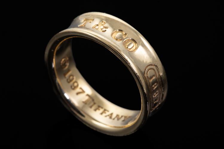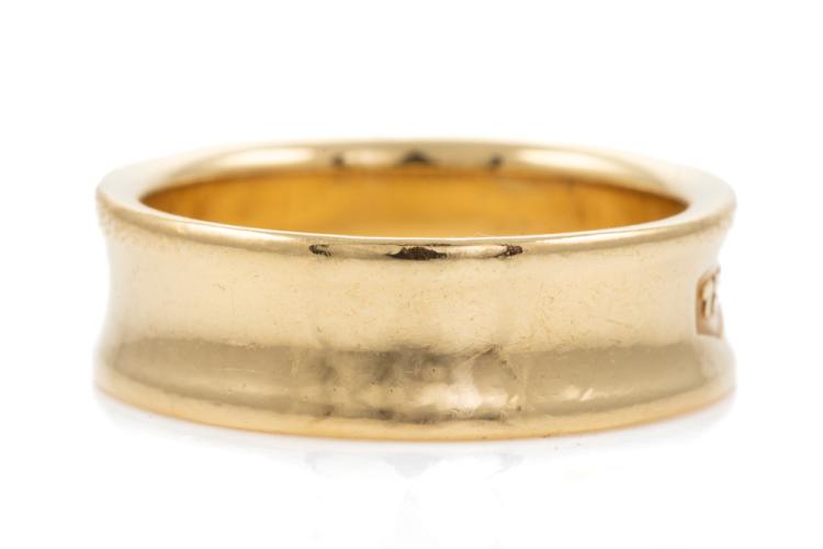 Tiffany & Co. 1837 ring. 18ct yellow gold. Ring size M - ring resizing is not recommended. Circa 1997. Width: 6.2mm. Weight: 7.2g. (Pre-owned)