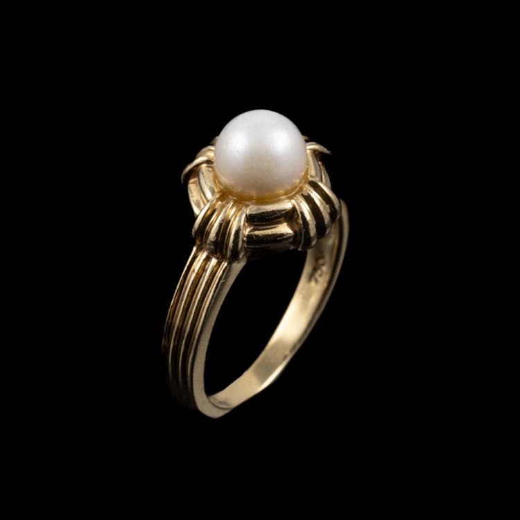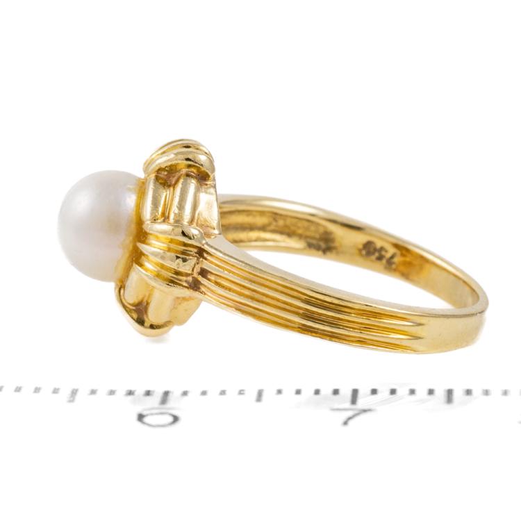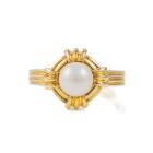 Tiffany & Co. Akoya Pearl ring with white Akoya Pearl of 6.2mm. 18ct yellow gold. Ring size I 1/2, - ring resizing is not recommended. Weight: 4.7g. (Pre-owned)