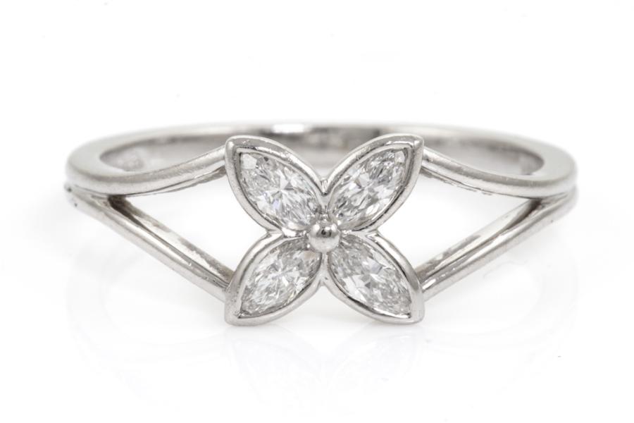 Tiffany & Co. Victoria Diamond ring with 4 marquise cut Natural Diamonds totalling approximately 0.44cts. Platinum 950. Ring size M - ring resizing is not recommended. Weight: 3.1g. Hallmark: Circa 1997 JAPAN. With Tiffany & Co. box. (Pre-owned)